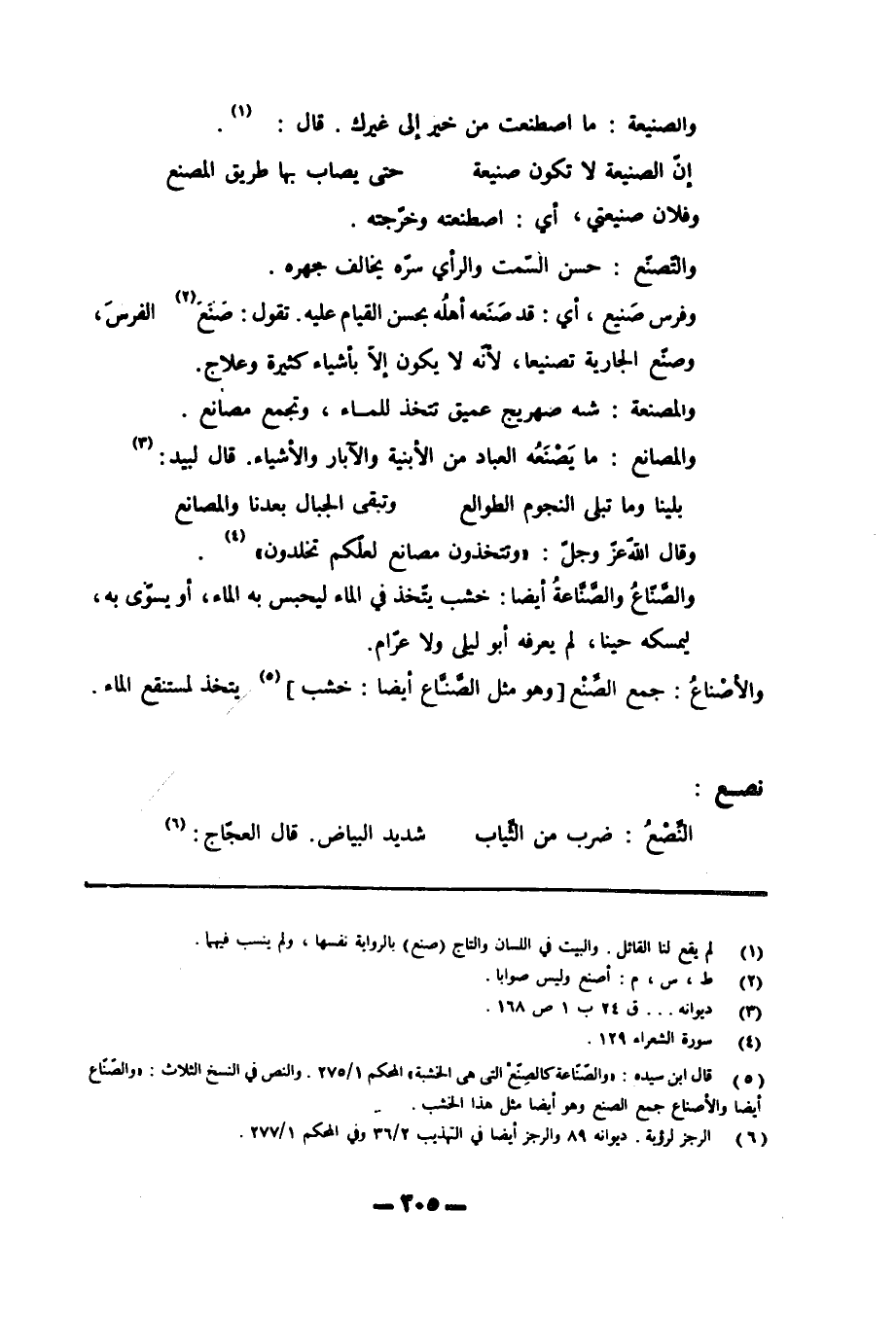 (5) قال ابن سيده: والصناعة كالصنع التي هي الخشبة المحكم 1/ 275. والنص في النسخ الثلاث: والصناع أيضا والأصْناعُ جمع الصِّنْع وهو أيضا مثل هذا الخشب.