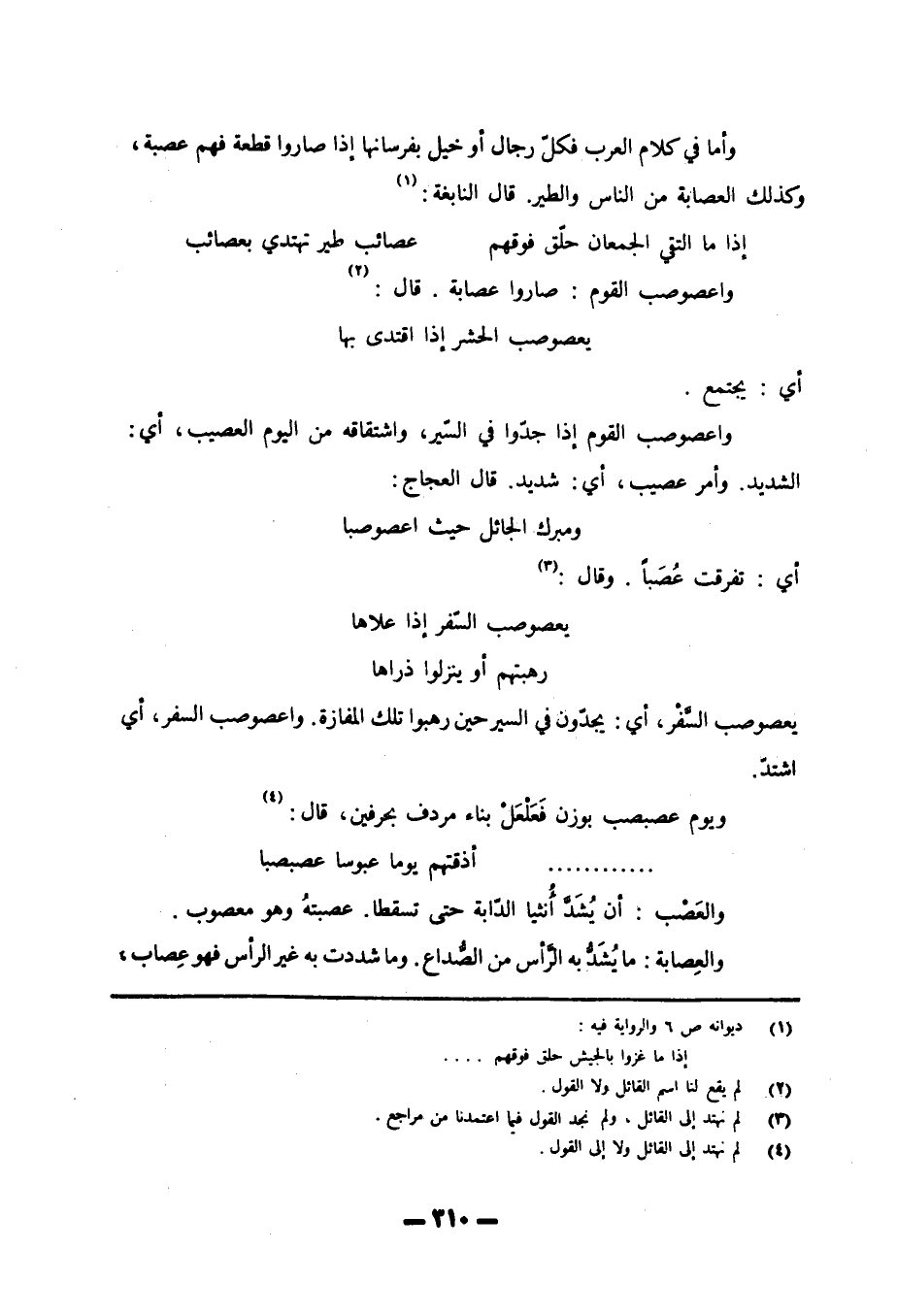 وأما في كلام العرب فكل رجال أو خيل بفرسانها إذا صاروا قطعة فهم عصبة، وكذلك العصابة من الناس والطير. قال النابغة: «1»