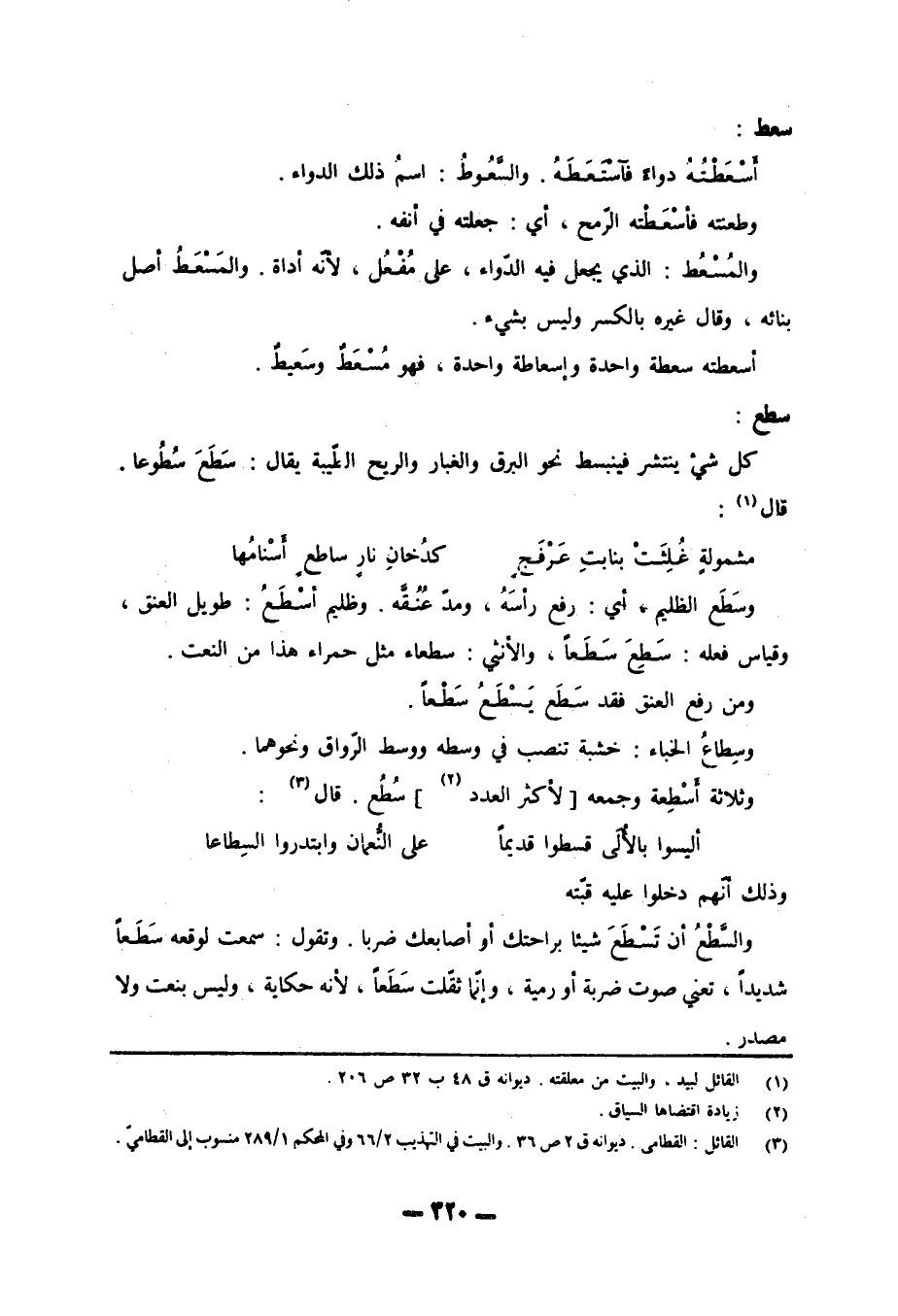 سعط: أَسْعَطْتُهُ دواءً فاسْتَعَطَهُ. والسَّعُوطُ: اسمُ ذلك الدواء. وطعنته فأسْعَطْته الرّمح، أي: جعلته في أنفه. والمُسْعُط: الذي يجعل فيه الدّواء، على مُفْعُل، لأنّه أداة. والمَسْعَطُ أصل بنائه، وقال غيره بالكسر وليس بشيء. أسعطته سعطة واحدة وإسعاطة واحدة، فهو مُسْعَطٌ وسَعيطٌ.