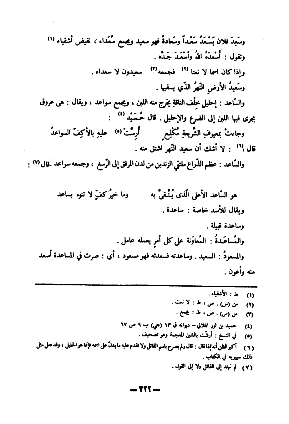 قال «6» : لا أشك أن سعيد النهر اشتق منه. والسّاعد: عظم الذّراع ملتقي الزندين من لدن المرفق إلى الرّسغ، وجمعه سواعد. قال «7» :