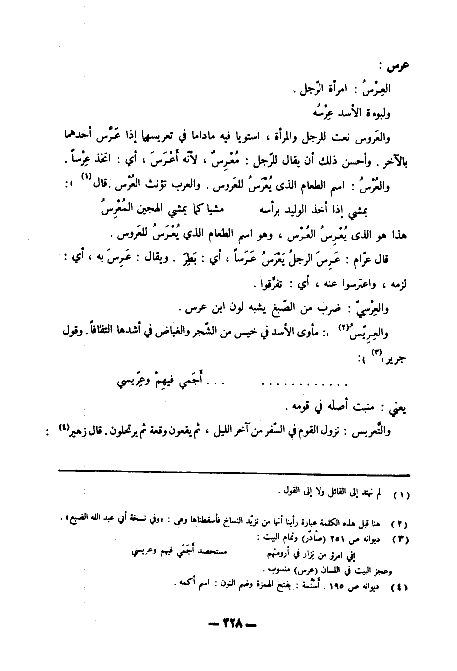 عرس: العِرْسُ: امرأة الرّجل. ولبوءة الأسد عِرْسُه والعَروس نعتٌ للرجل والمرأة، استويا فيه ما داما في تعريسهما إذا عَرَّس أحدهما بالآخر. وأحسن ذلك أن يقال للرجل: مُعْرِسٌ، لأنّه أَعْرَسَ، أي: اتخذ عِرْساً. والعُرْسُ: اسم الطعام الذي يُعْرَسُ للعّروس. والعرب تؤنث العُرْس. قال: «1»