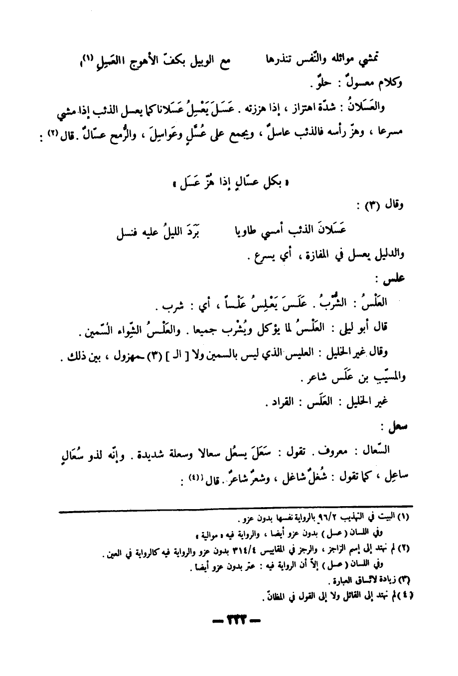 وكلام معسولٌ: حلوٌ. والعَسَلانُ: شدّة اهتزاز، إذا هززته. عَسَلَ يَعْسِلُ عَسَلانا كما يعسل الذئب إذا مشي مسرعا، وهزّ رأسه فالذئب عاسلٌ، ويجمع على عُسَّلٍ وعَواسِلَ، والرُّمح عسّالٌ. قال: «2»