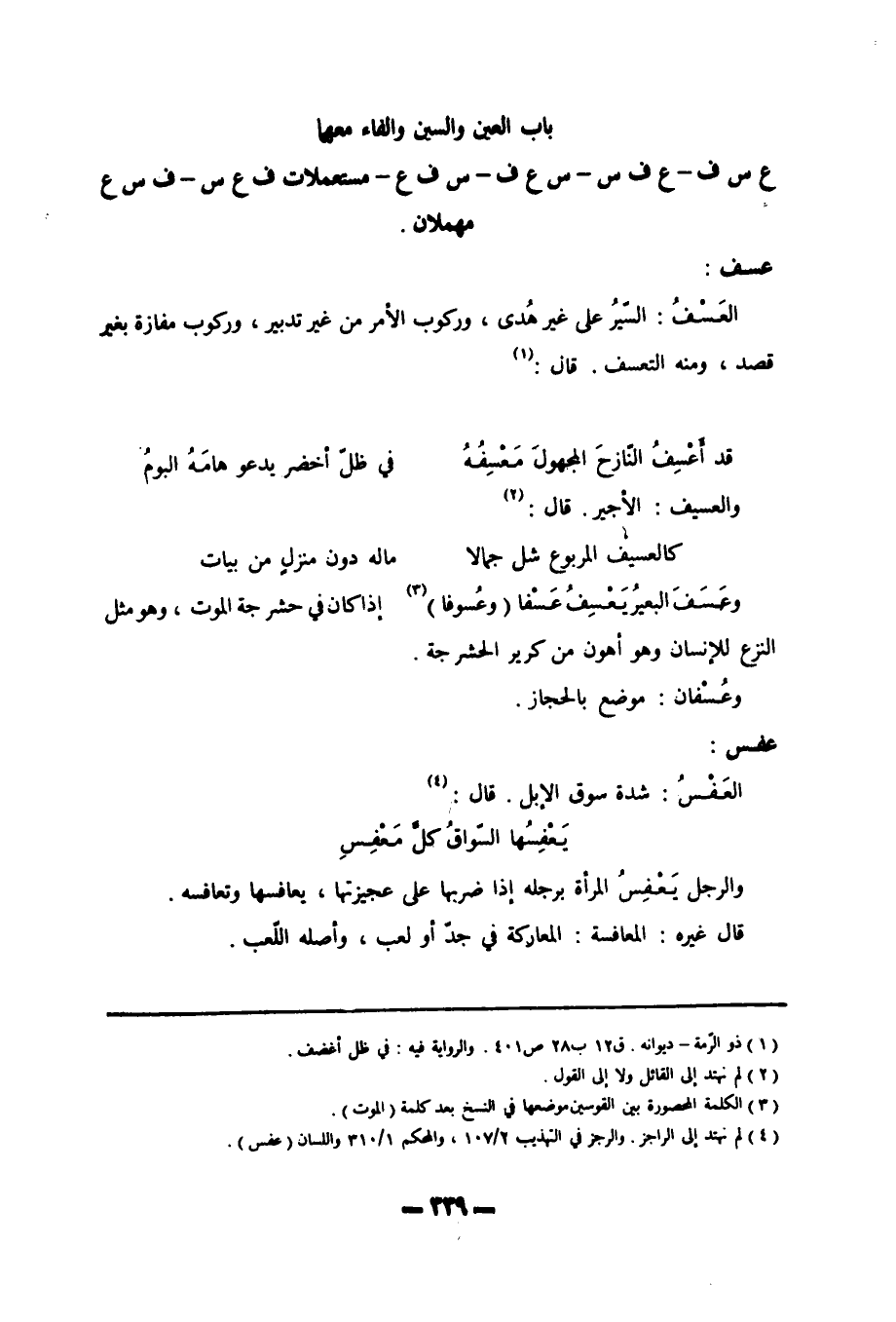 باب العين والسين والفاء معهما ع س ف- ع ف س- س ع ف- س ف ع- مستعملات ف ع س- ف س ع مهملان