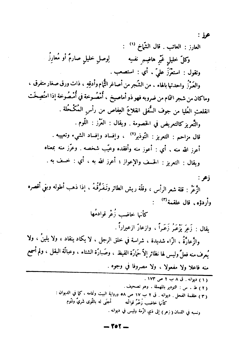 وتقول: استعرز عليّ، أي: استصعب. والعَرْزُ واحدتها بالهاء، من الشّجر من أصاغر الثُّمام وأدقِهِ، ذات ورق صغار متفرق، وما كان من شجر الثمام من ضروبه فهو ذو أماصيخ، أُمْصُوخة في أُمْصُوخة إذا امتُصِخَت انقلعتِ العُليا من جوف السُّفلى انقلاعَ العِفاص من رأسِ المُكْحُلة. والتَّعريز كالتعريض في الخصومة. ويقال: العَرْز: اللّوم. قال مزاحم: التعريز: التّوذير «2» ، وإفساد وإفساد الشيء وتعييبه. أعرز الله منه، أي: أعوز منه وأفقده وعيّب شخصه. وعرّز منه بمعناه ويقال: التعريز: الخسف والإعواز، أعرز الله به، أي: خسف به.