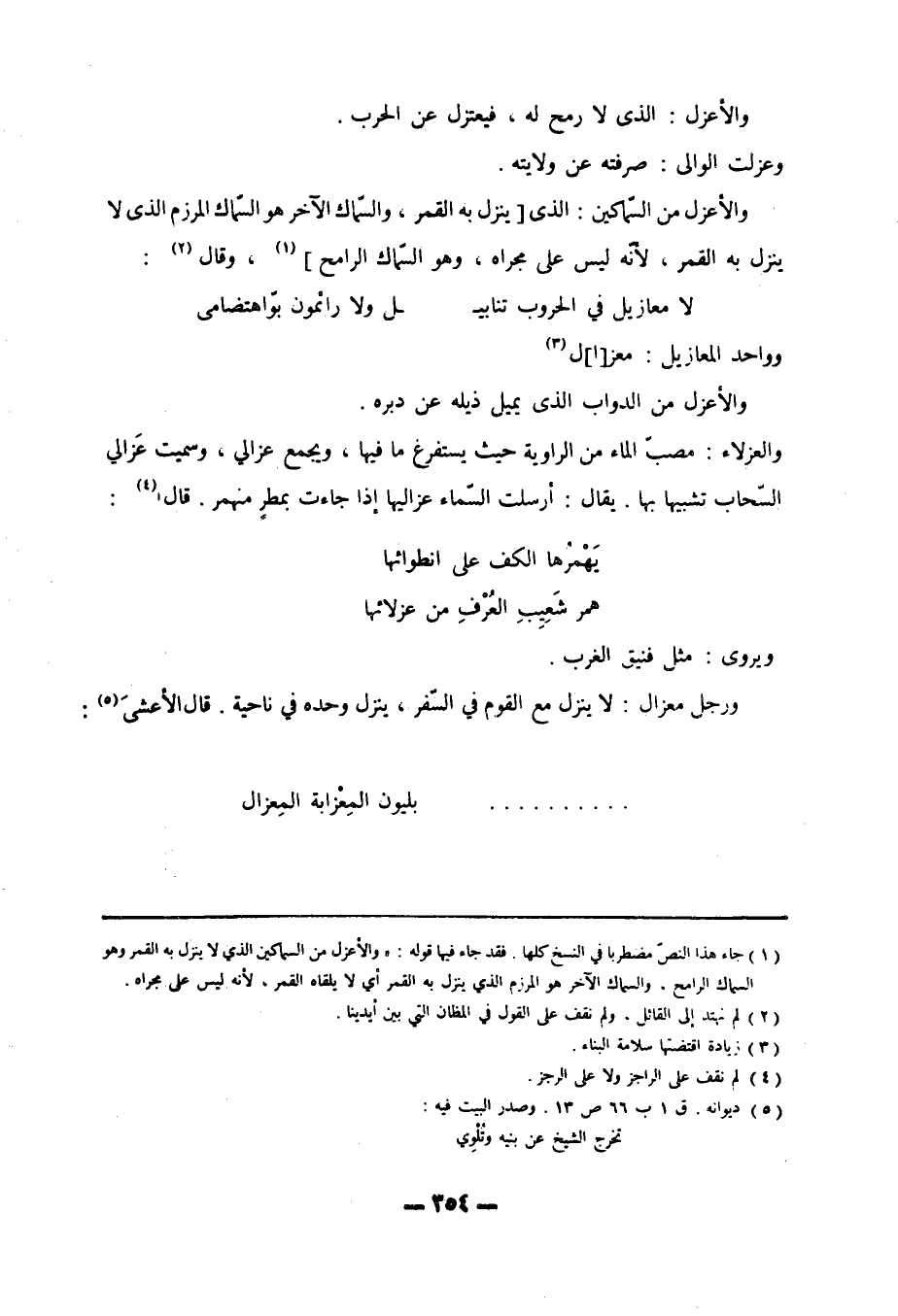 وواحد المعازيل: معز [ا] ل «3» والأعزل من الدواب الذي يميل ذيله عن دبره. والعزلاء: مصبّ الماء من الرواية حيث يستفرغ ما فيها، ويجمع عزالي وسميت عَزالي السّحاب تشبيها بها. يقال: أرسلت السّماء عزاليها إذا جاءت بمطرٍ منهمر. قال «4» :