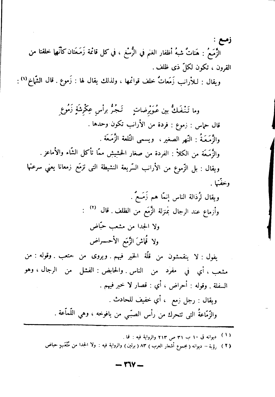 قال حماس: زموع: فردة من الأرانب تكون وحدها. والزَّمَعَة: النهر الصغير، ويسمى التلعة الزمعة. والزَّمَعَة من الكلأ: الفردة من صغار الحشيش مما تأكل الشاء والأماعز. ويقال: بل الزّموع من الأرانب السّريعة النشيطة التي تزمَع زمعانا يعني سرعتها وخفّتها. ويقال لُرذالة الناس إنمّا هم زَمَعٌ. وأزماع عند الرجال بمنزلة الزَّمَع من الظلف. قال «2» :