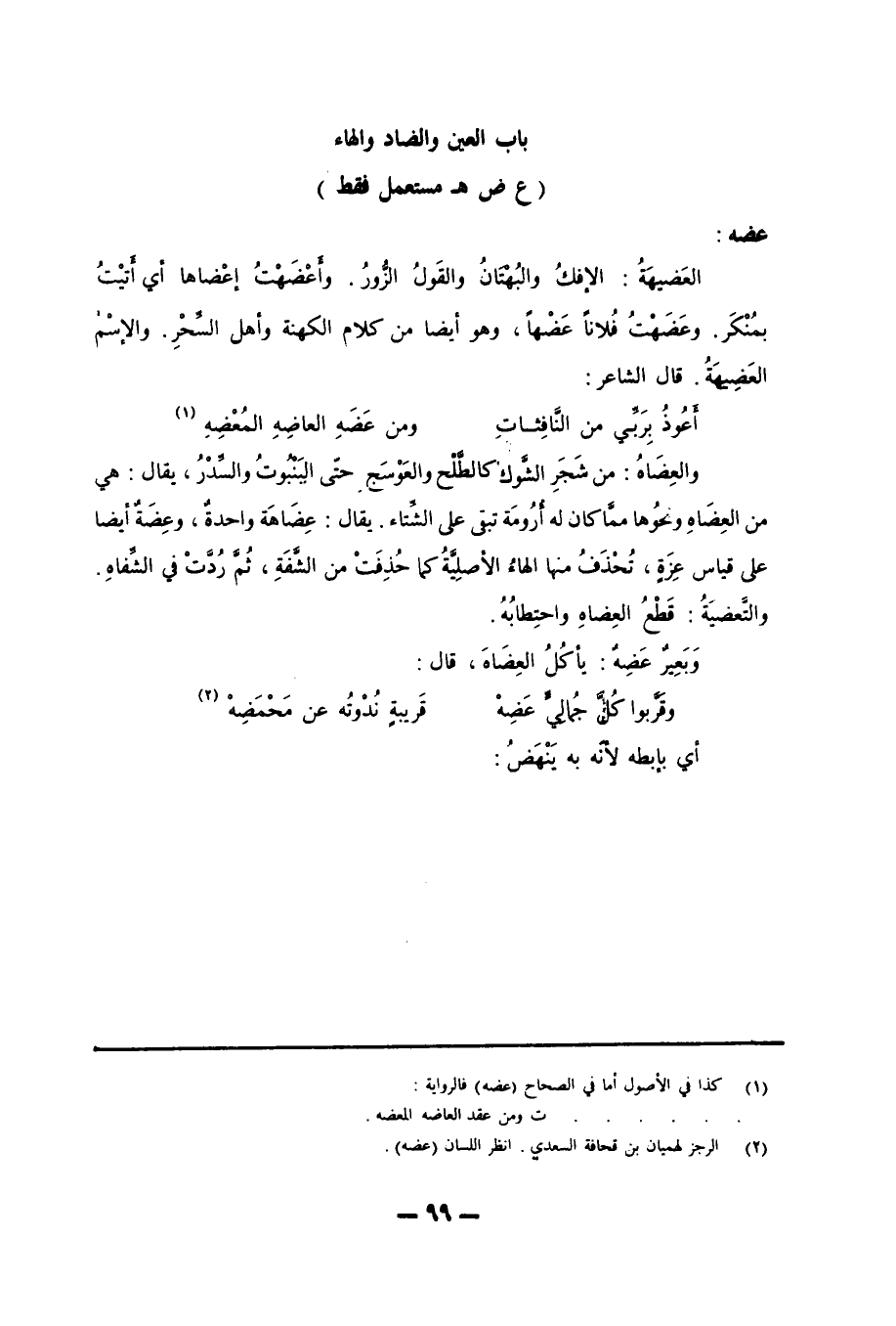 (2) الرجز (لهميان بن قحافة السعدي) انظر اللسان (عضه) .