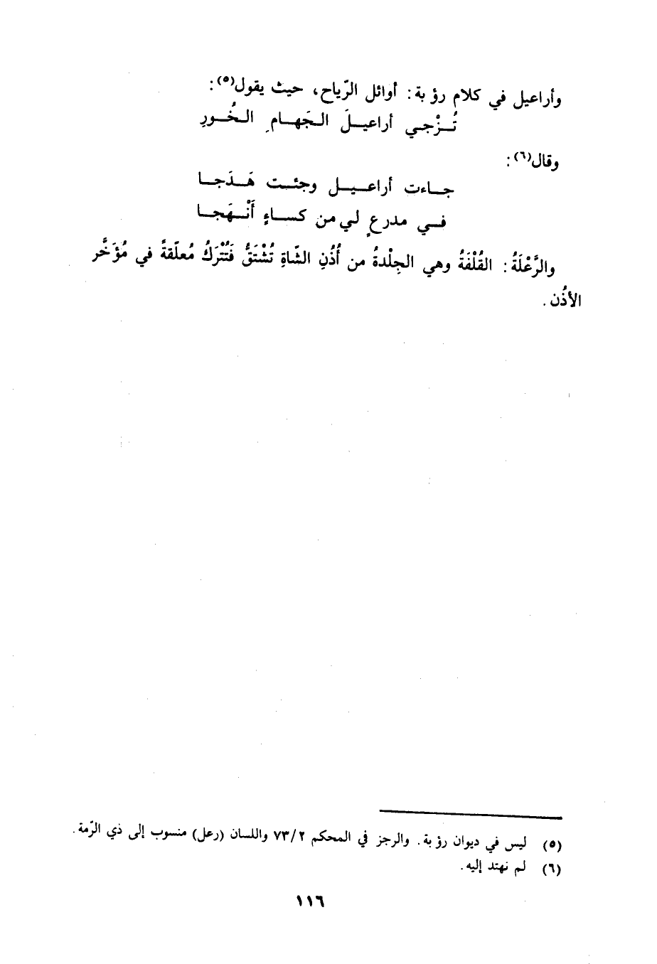 (5) ليس في ديوان رؤبة. والرجز في المحكم 2/ 73 واللسان (رعل) منسوب إلى (ذي الرمة) .