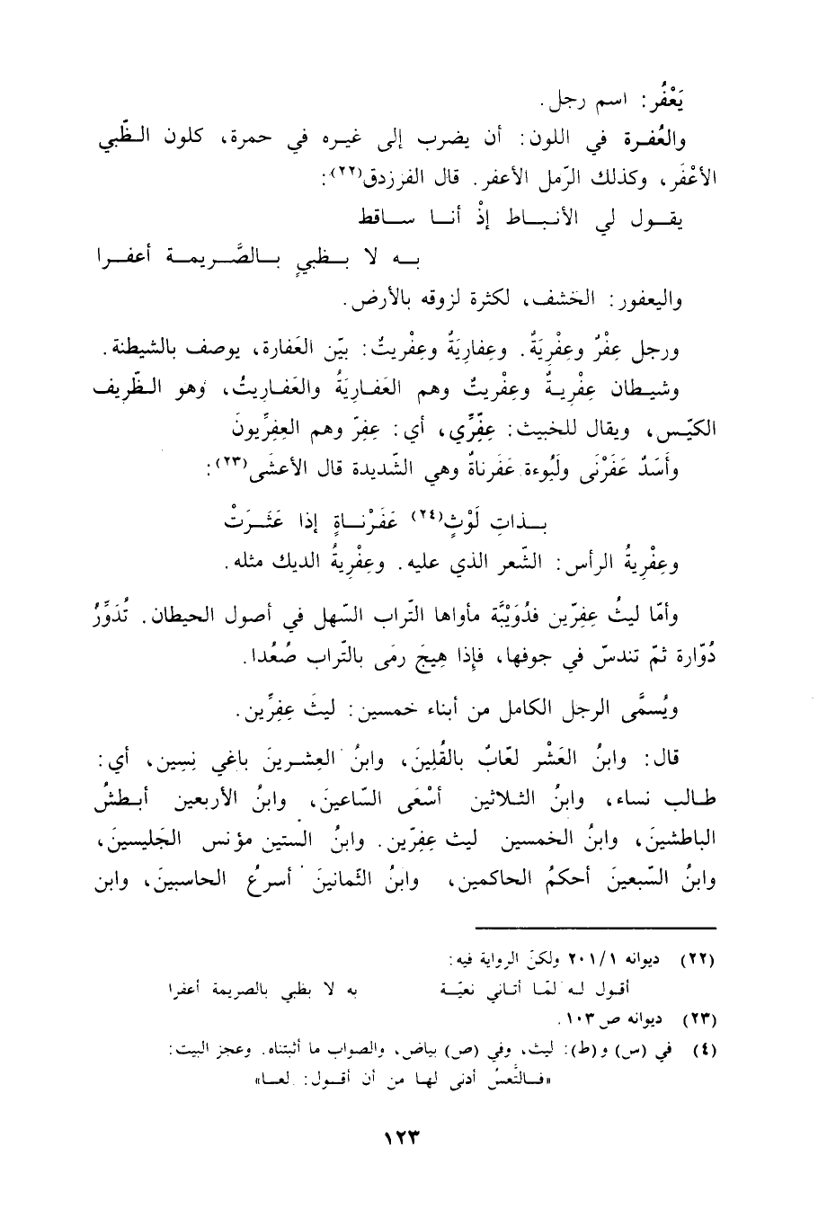 واليعفور: الخشف، لكثرة لزوقه بالأرض. ورجل عِفْرٌ وعِفْرِيَةٌ. وعِفارِيَةٌ وعِفْريتٌ: بيّن العَفارة، يوصف بالشيطنة. وشيطان عِفْرِيةٌ وعِفْريتٌ وهم العَفارِيَة والعَفارِيتُ، وهو الظّريف الكيّس، ويقال للخبيث: عِفِّرِّي، أي: عِفِرّ وهم العفريون وأسد عفرنى ولبوءة عَفَرناةٌ وهي الشّديدة قال الأعشى «23» :