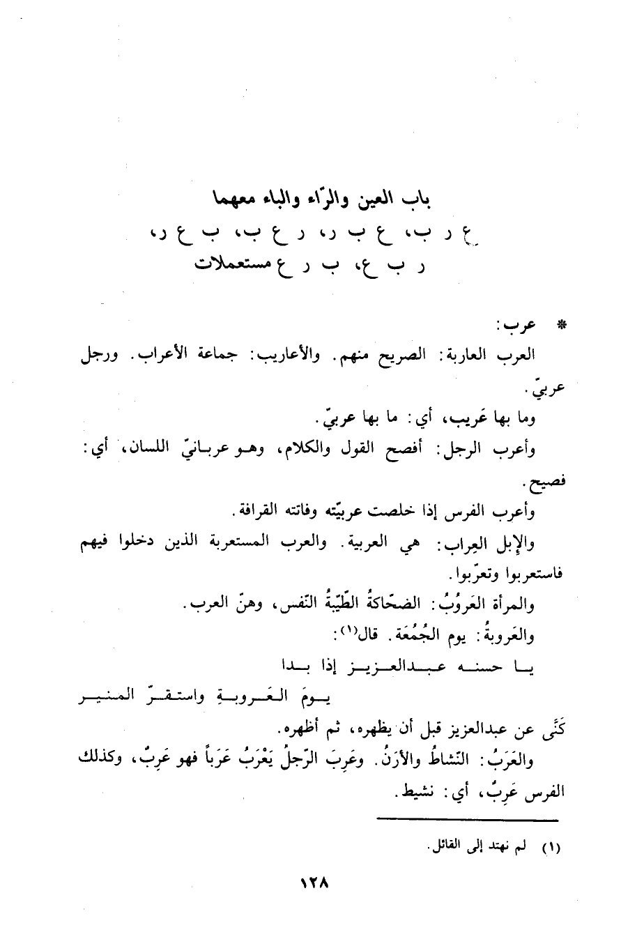 عرب: العرب العاربة: الصريح منهم. والأعاريب: جماعة الأعراب. ورجل عربيّ. وما بها عَريب، أي: ما بها عربيّ. وأعرب الرجل: أفصح القول والكلام، وهو عربانيّ اللسان، أي: فصيح. وأعرب الفرس إذا خلصت عربيّته وفاتته القرافة. والإبل العِراب: هي العربية والعرب المستعربة الذين دخلوا فيهم فاستعربوا وتعرّبوا. والمرأة العَروُبُ: الضحّاكة الطّيّبةُ النّفس، وهنّ العرب. والعَروبةُ: يوم الجُمُعَة. قال «1» :