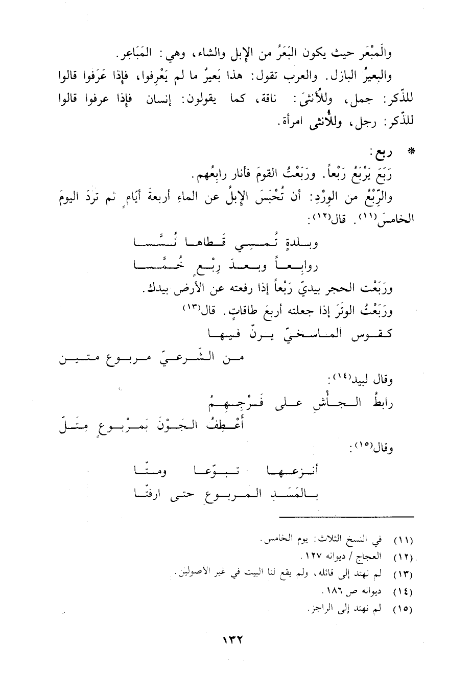 ربع: رَبَعَ يَرْبَعُ رَبْعاً. ورَبَعْتُ القومَ فأنار رابِعُهم. والرِّبْعُ من الوِرْدِ: أن تُحْبَسَ الإبلُ عن الماءِ أربعةَ أيّامٍ ثم تردَ اليومَ الخامسَ «11» . قال «12» :