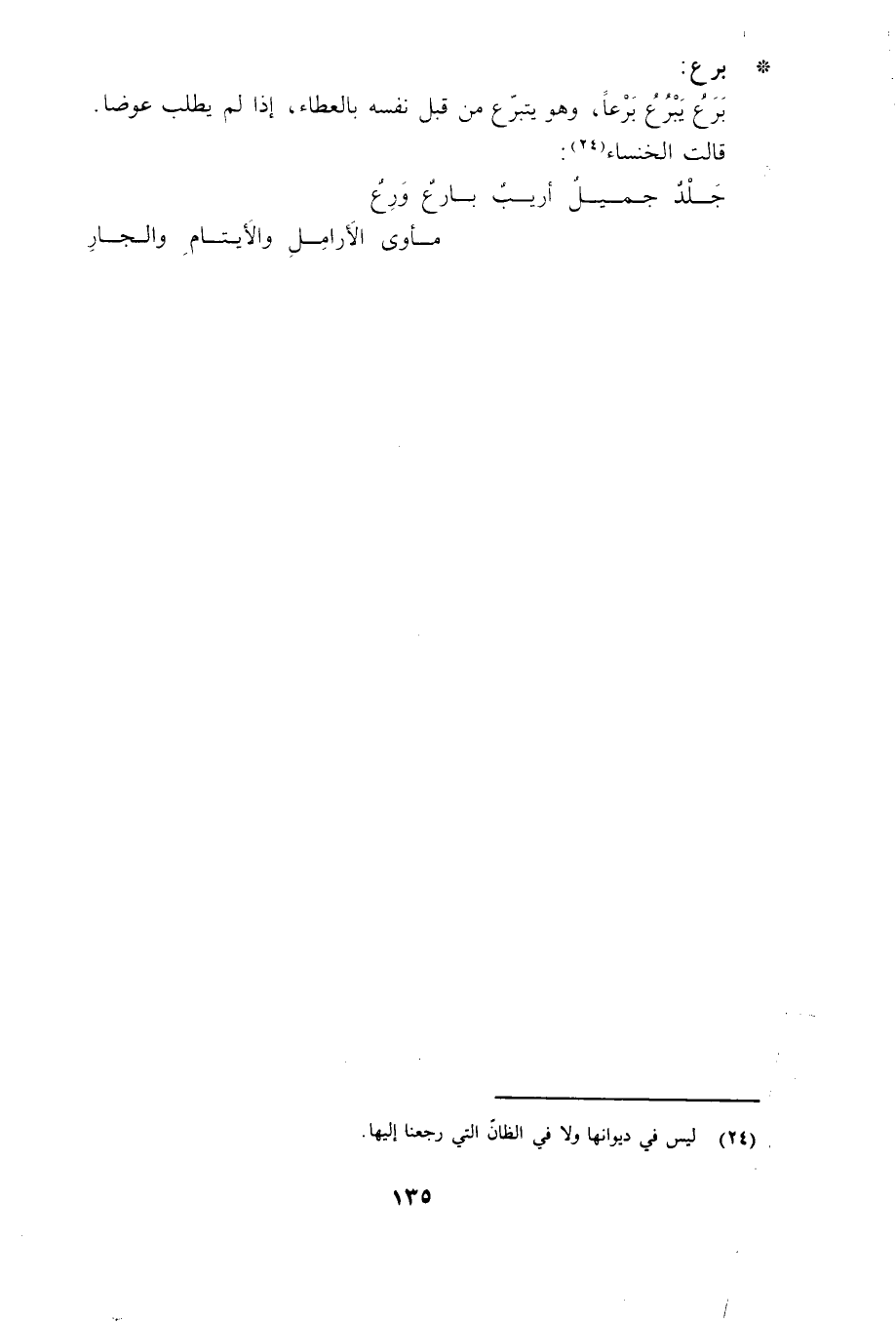 برع: بَرَعَ يَبْرُعُ بَرْعاً، وهو يتبرّع من قبل نفسه بالعطاء، إذا لم يطلب عوضاً. قالت الخنساء «24» :