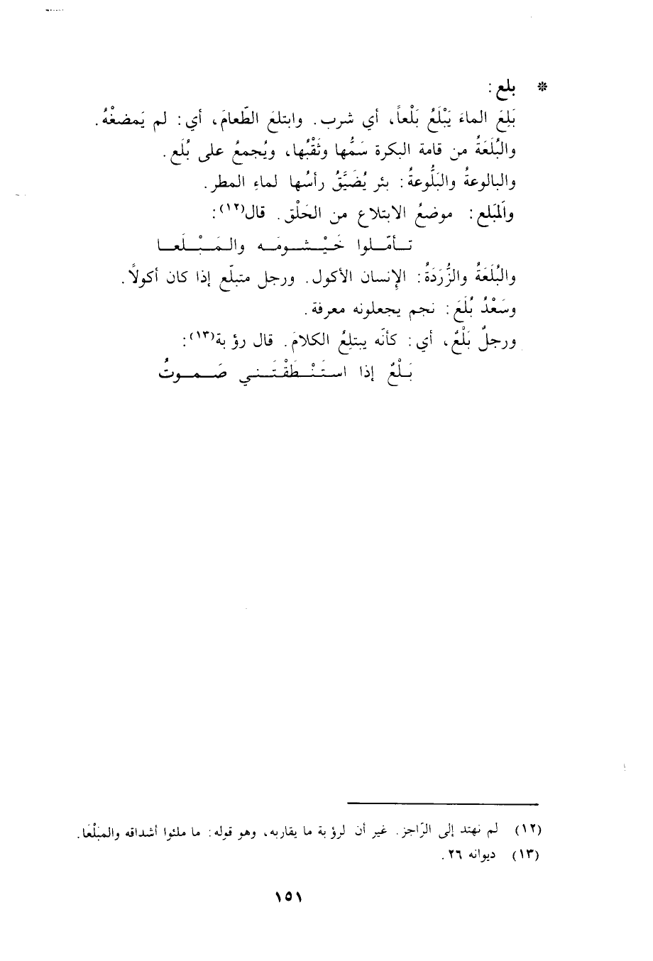 والبُلَعَةُ والزُّرَدَةُ: الإنسان الأكول. ورجل متبلّع إذا كان أكولاً. وسَعْدُ بَلْعٌ: نجم يجعلونه معرفة. ورجلٌ بَلْعٌ، أي: كأنّه يبتلِعُ الكلامَ. قال رؤبة «13» :
