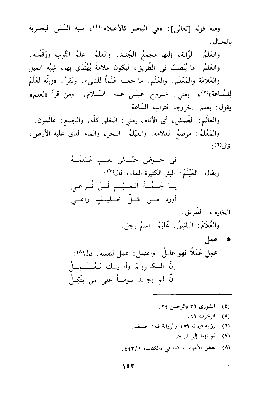 «4» *، شبه السّفن البحرية بالجبال. والعَلَمُ: الرّاية، إليها مجمعُ الجُند. والعَلَمُ: عَلَمُ الثّوبِ ورَقْمُه. والعَلَمُ: ما يُنْصَبُ في الطّريق، ليكون علامةً يُهْتَدَى بها، شِبْه الميل والعَلامَة والمَعْلَم. والعَلَم: ما جعلته عَلَماً للشيء. ويُقرأ: وَإِنَّهُ لَعِلْمٌ لِلسَّاعَةِ «5» ، يعني: خروج عيسَى ع، ومن قرأ لعلم يقول: يعلم بخروجه اقتراب السّاعة. والعالَم: الطّمش، أي الأنام، يعني: الخلق كلّه، والجمع: عالَمون. والمَعْلَمُ: موضعُ العلامة. والعَيْلَمُ: البحر، والماء الذي عليه الأرض، قال «6» :