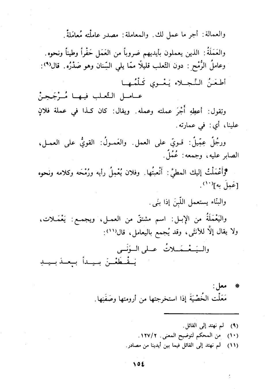 وتقول: أعطِهِ أَجْرَ عملته وعمله. ويقال: كان كذا في عملة فلانٍ علينا، أي: في عمارته. ورجُلٌ عِمِّيلٌ: قويّ على العمل. والعَمولُ: القويُّ على العمل، الصابر عليه، وجمعه: عُمُلٌ. وأَعْمَلْتُ إليك المطيَّ: أَتْعبتُها. وفلان يُعْمِلُ رأيه ورُمْحَه وكلامه ونحوه [عَمِلَ به] «10» . والبنّاء يستعمل اللّبِنَ إذا بنَى. واليَعْمَلَةُ من الإبل: اسم مشتقّ من العمل، ويجمع: يَعْمَلات، ولا يقال إلاّ للأنثى، وقد يُجمع باليعامل، قال «11» :