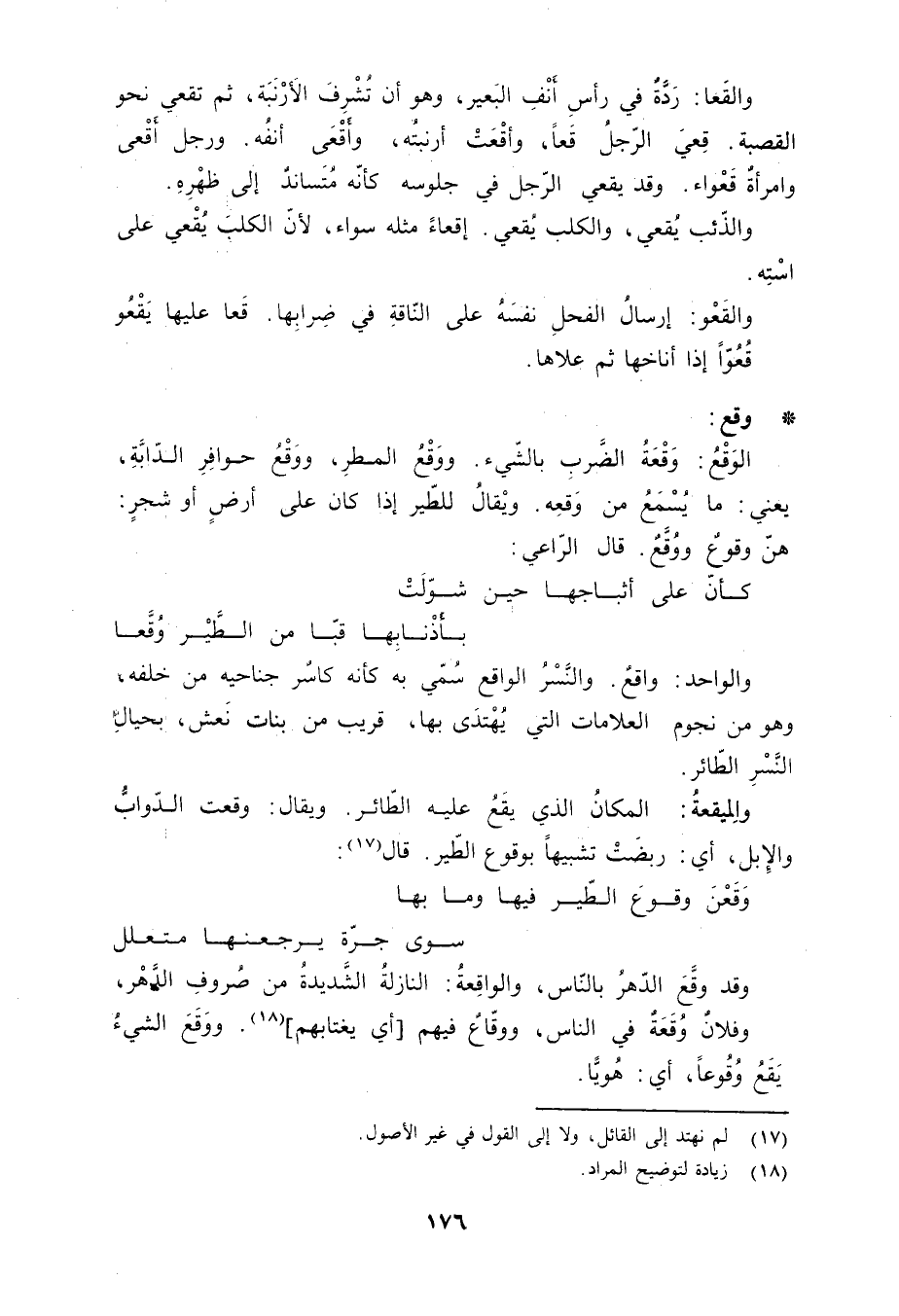 والواحد: واقعٌ. والنَّسْرُ الواقع سُمّي به كأنه كاسرٌ جناحيه من خلفه، وهو من نجوم العلامات التي يُهْتَدَى بها، قريب من بنات نَعش، بحيالِ النَّسْرِ الطّائر. والمِيقعةُ: المكانُ الذي يقَعُ عليه الطّائر. ويقال: وقعت الدّوابُّ والإبل، أي: ربضَتْ تشبيهاً بوقوع الطّير. قال «17» :