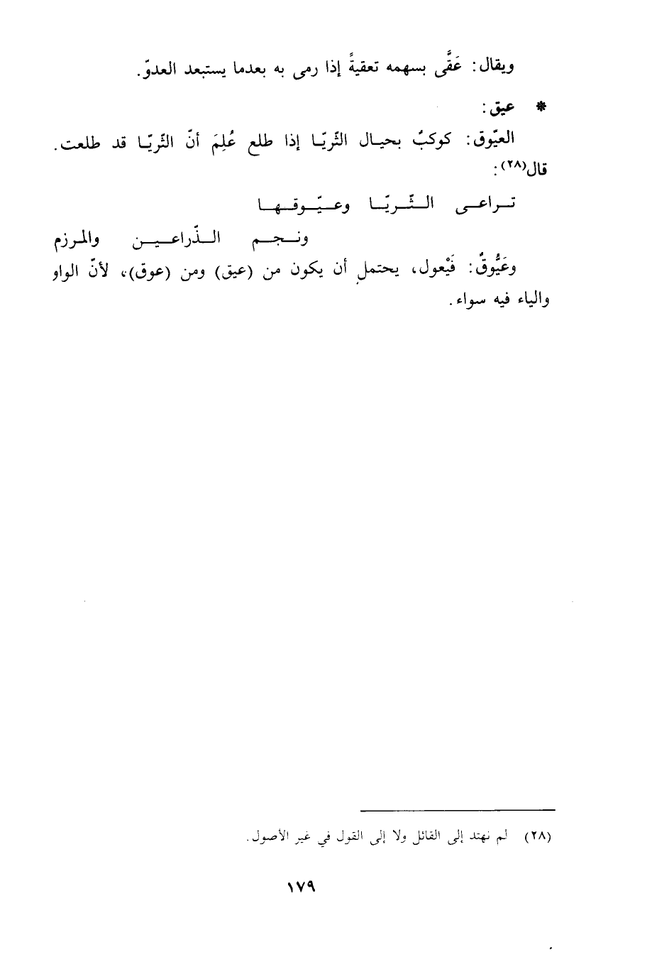 . عيق: العيّوق: كوكبٌ بحيال الثّريّا إذا طلع عُلِمَ أنّ الثّريّا قد طلعت. قال «28» :