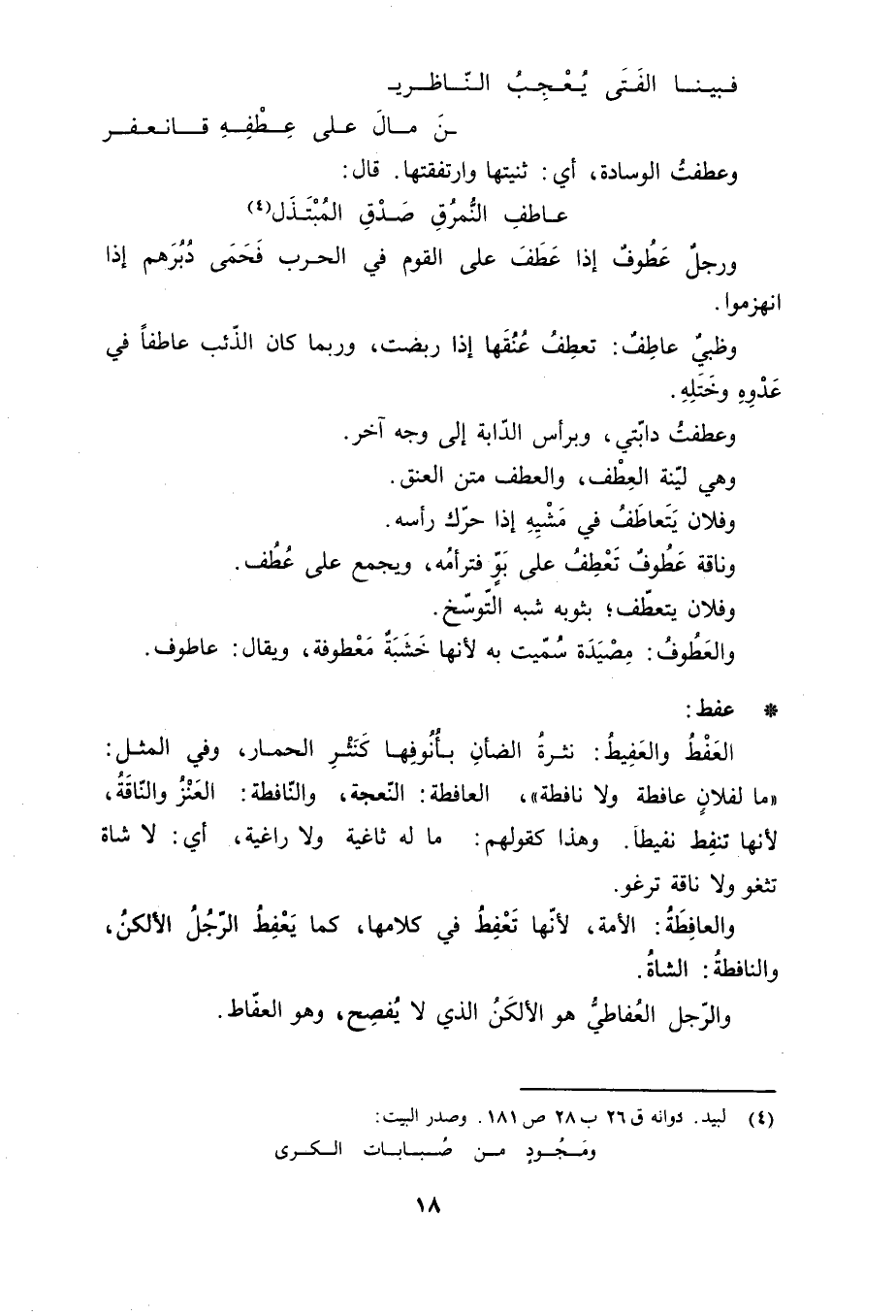 عفط: العَفْطُ والعَفِيطُ: نثرةٌ الضأنِ بأُنُوفِها كَنَثْرِ الحمار، وفي المثل: ما لفلانٍ عافطة ولا نافطة، العافطة: النّعجة، والنّافطة: العَنْزُ والنّاقَةُ، لأنها تنفِط نفيطاً. وهذا كقولهم: ما له ثاغية ولا راغية، أي: لا شاة تثغو ولا ناقة ترغو. والعافِطَةُ: الأمة، لأنّها تَعْفِطُ في كلامها، كما يعفط الرجل الألكن، والنافطة: الشاة. والرجل العُفاطيُّ هو الألكَنُ الذي لا يُفْصِح، وهو العفّاط.