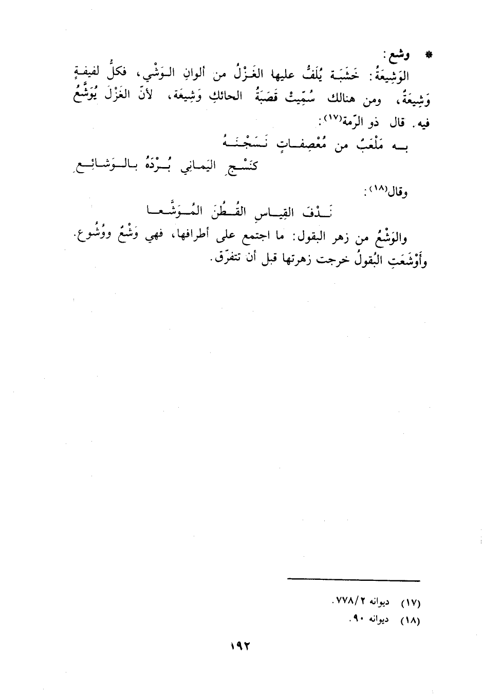وشع: الوَشِيعَةُ: خَشَبَة يُلَفُّ عليها الغَزْلُ من ألوان الوَشْي، فكلُّ لفيفةٍ وَشِيعةٌ، ومن هنالك سُمِّيتْ قَصَبَةُ الحائكِ وَشِيعَة، لأنّ الغَزْلَ يُوَشَّعُ فيه. قال ذو الرّمة «17» :