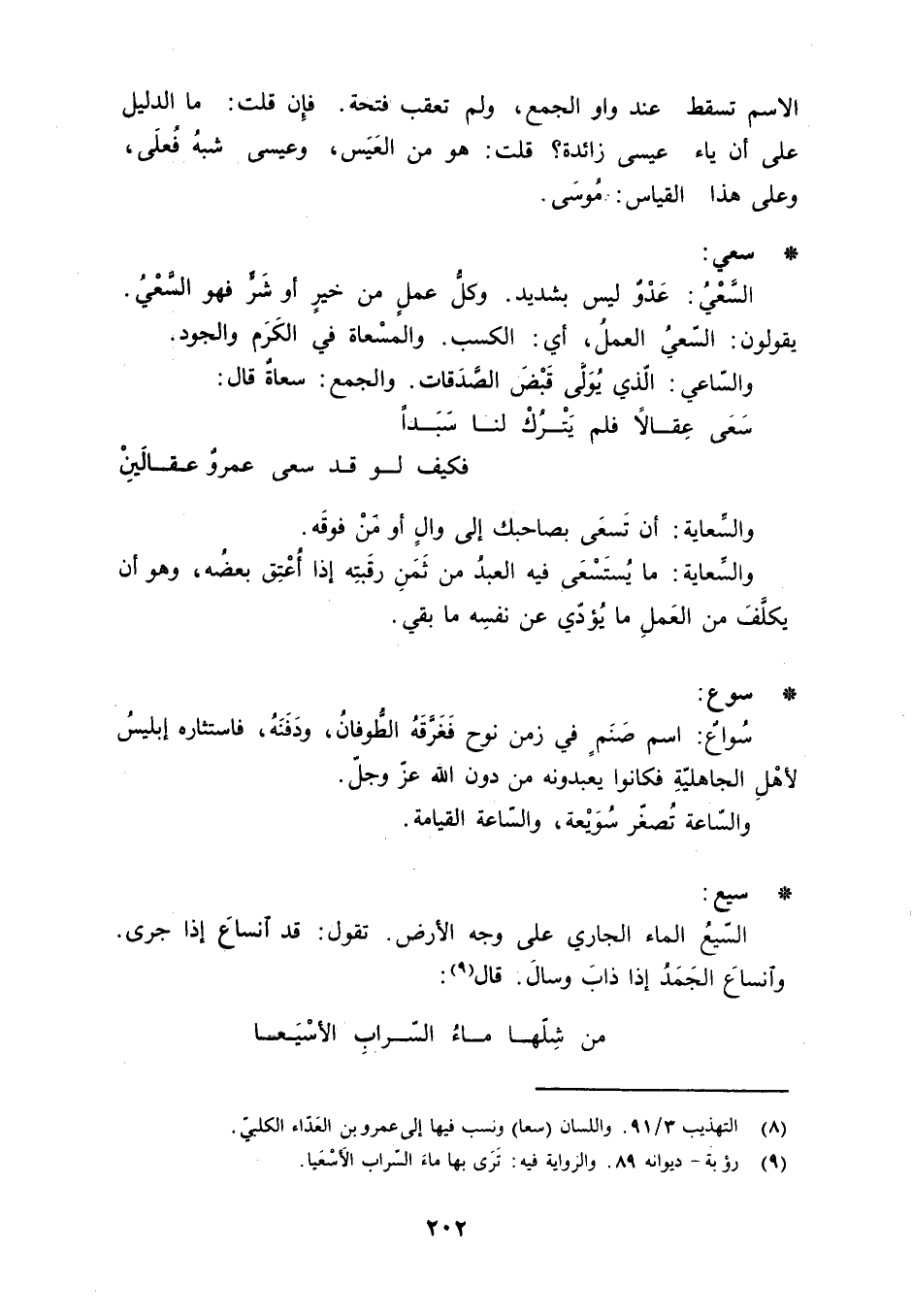 سعي: السَّعْيُ: عَدْوٌ ليس بشديد. وكلُّ عملٍ من خيرٍ أو شَرٍّ فهو السَّعْيُ. يقولون: السّعيُ العملُ، أي: الكسب. والمسْعاة في الكَرَم والجود. والسّاعي: الذي يُوَلّى قَبْضَ الصَّدَقات. والجمع: سعاةٌ قال: