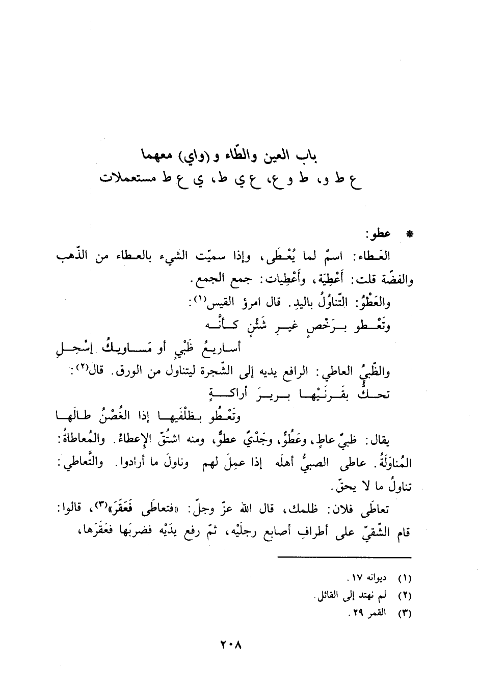 عطو: العَطاء: اسمٌ لما يُعْطَى، وإذا سمّيت الشيء بالعطاء من الذّهب والفضّة قلت: أَعْطِيَة، وأَعْطِيَات: جمع الجمع. والعَطْوُ: التّناوُلُ باليدِ. قال امرؤ القيس «1» :