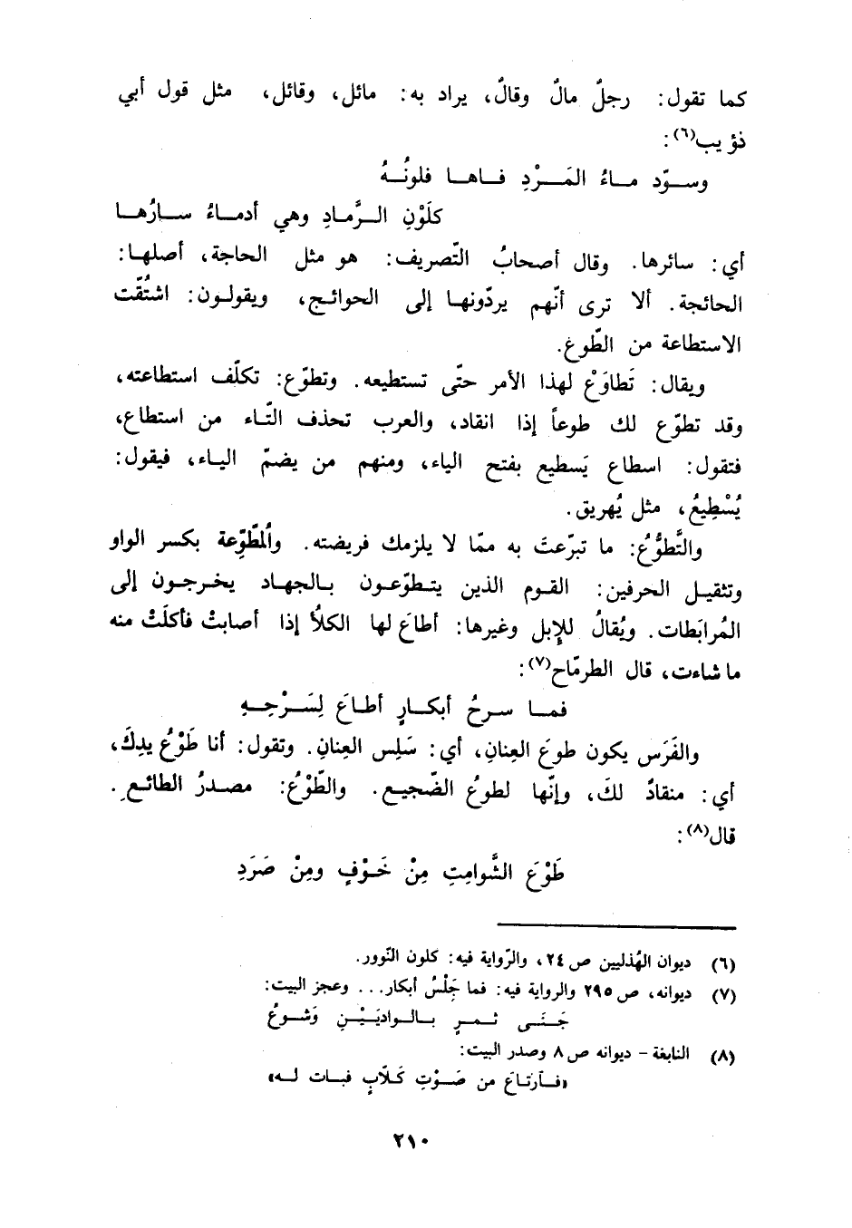 أي: سائرها. وقال أصحابُ التّصريف: هو مثل الحاجة، أصلها: الحائجة. ألا ترى أنّهم يردّونها إلى الحوائج، ويقولون: اشتُقّت الاستطاعة من الطّوع. ويقال: تَطاوَعْ لهذا الأمر حتّى تستطيعه. وتطوّع: تكلّف استطاعته، وقد تطوّع لك طوعاً إذا انقاد، والعرب تحذف التّاء من استطاع، فتقول: اسطاع يَسطيع بفتح الياء، ومنهم من يضمّ الياء، فيقول: يُسْطِيعُ، مثل يُهريق. والتَّطوُّعُ: ما تبرّعت به ممّا لا يلزمك فريضته. والمُطّوِّعة بكسر الواو وتثقيل الحرفين: القوم الذين يتطوّعون بالجهاد يخرجون إلى المُرابَطات. ويقال للإبل وغيرها: أطاعَ لها الكلأ إذا أصابتْ فأكلَتْ منه ما شاءت، قال الطرمّاح «7» :