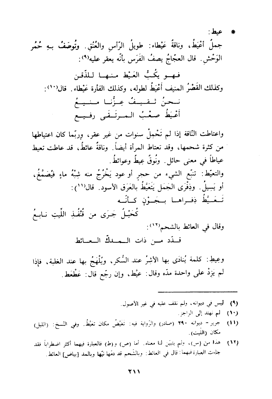 (11) (جرير) ديوانه 290 (صادر) والرواية فيه: تغيض مكان تعيط. وفي النسخ: (الليل) مكان (الليت) .
