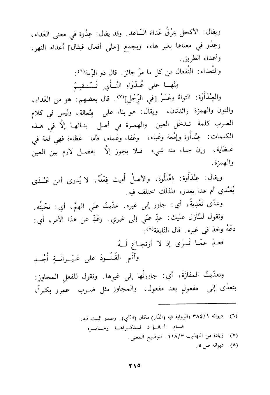 والعِنْدَأْوَة: التواءٌ وعَسَرٌ [في الرِّجْلِ] «7» . قال بعضهم: هو من العَداءِ، والنون والهمزة زائدتان، ويقال: هو بناء على فِنْعالة، وليس في كلام العرب كلمة تدخل العين والهمزة في أصل بنائها إلاّ في هذه الكلمات: عِنْدأْوة وإمَّعة وعَباء، وعَفاء وعَماء، فأمّا عَظاءة فهي لغة في عَظاية، وإن جاء منه شيء فلا يجوز إلاّ بفصل لازم بين العين والهمزة. ويقال: عِنْدَأوة: فِعْلَلْوة، والأصلُ أُمِيتَ فِعْلُهُ، لا يُدرى أمن عَنْدَى يُعْنَدي أم عدا يعدو، فلذلك اختلف فيه. وعدّى تَعْدِيَةً، أي: جاوز إلى غيره. عدّيتُ عنّي الهمَّ، أي: نحّيتُه. وتقول للنّازل عليك: عدِّ عنّي إلى غيري. وعَدِّ عن هذا الأمر، أي: دعْهُ وخذ في غيره. قال النّابغة «8» :