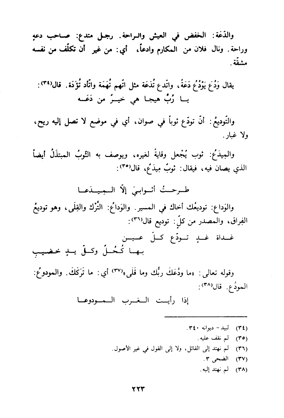 والوداع: توديعُك أخاك في المسير. والوَداعُ: التَّرْك والقِلَى، وهو توديعُ الفِراق، والمصدر من كلٍّ: توديع قال «38» :