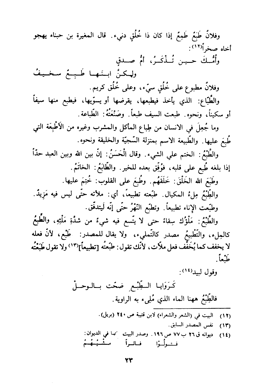 وفلانٌ مطبوع على خُلُق سيّء، وعلى خُلُق كريم. والطباع: الذي يأخذ فيطبعها، يقرضها أو يسوّيها، فيطبع منها سيفاً أو سكيناً، ونحوه. طبعت السيف طبعاً. وصَنْعَتُهُ: الطّباعة. وما جُعِلَ في الإنسان من طِباع المأكل والمشرب وغيره من الأَطْبِعَة التي طُبِعَ عليها. والطّبيعة الاسم بمنزلة السّجيّة والخليقة ونحوه. والطَّبْعُ: الختم على الشيء. وقال الحَسَنُ: إنّ بين الله وبين العبد حدّاً إذا بلغه طُبع على قلبه، فوُفِّق بعده للخير. والطّابَعُ: الخاتَمُ. وطَبَعَ الله الخَلْقَ: خَلَقَهُم. وطُبِعَ على القلوب: خُتِمَ عليها. والطِّبْعُ ملءُ المكيال. طبّعته تطبيعاً، أي: ملأته حتّى ليس فيه مَزِيدٌ. وطبّعت الإناء تطبيعاً. وتطبّع النّهْرُ حتّى إنّه لَيتدفّق. والطَّبْعُ: ملؤك سقاء حتّى لا يتّسع فيه شيءُ من شدَّةِ مَلْئِهِ، والطَّبعُ كالمِلء، والتّطْبيعُ مصدر كالتّمليء، ولا يقال للمصدر: طّبْع، لأنّ فعله لا يخفف كما يُخَفَّف فعل ملأت، لأنّك تقول: طبّعتُه [تطبيعاً] «13» ولا تقول طَبَعْتُه طبعا. وقول لبيد «14» :