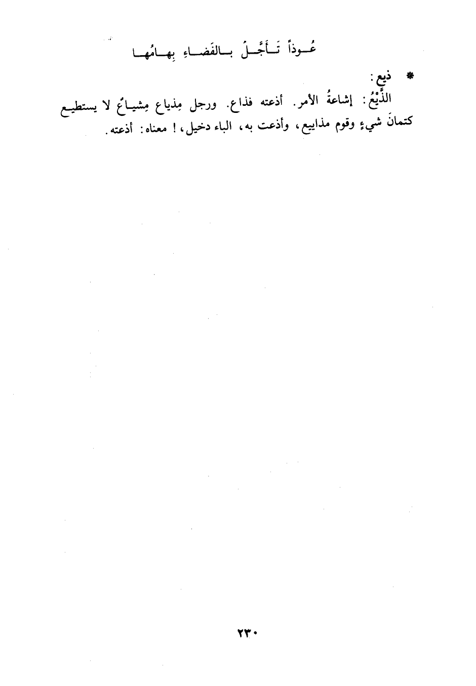 ذيع: الذَّيْعُ: إشاعةُ الأمر. أذعته فذاع. ورجل مِذياع مِشياعٌ لا يستطيع كتمانَ شيءٍ وقوم مذاييع، وأذعت به، الباء دخيل،! معناه: أذعته.