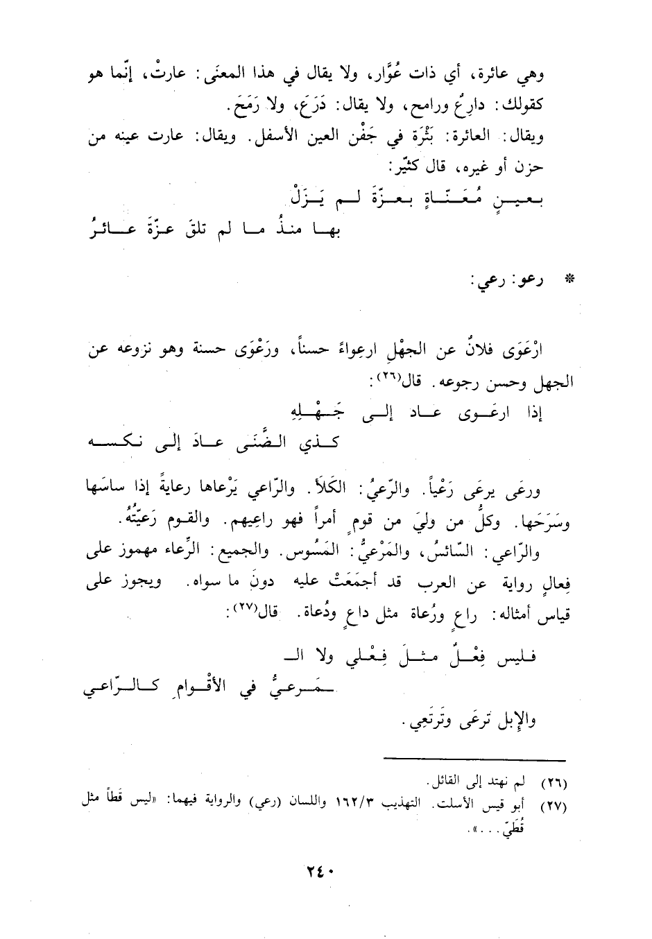 ورعَى يرعَى رَعْياً. والرّعيُ: الكَلأ. والرّاعي يَرْعاها رعايةً إذا ساسَها وسَرَحَها. وكلُّ من وليَ من قومٍ أمراً فهو راعِيهم. والقوم رَعيّتُهُ. والرّاعي: السّائسُ، والمَرْعيُّ: المَسُوس. والجميع: الرِّعاء مهموز على فِعالٍ رواية عن العرب قد أجمَعَتْ عليه دونَ ما سواه. ويجوز على قياس أمثاله: راعٍ ورُعاة مثل داعٍ ودُعاة. قال «27» :