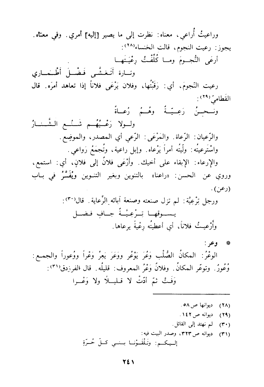 وراعيتُ أُراعي، معناه: نظرت إلى ما يصير [إليه] أمري. وفي معناه: يجوز: رعيت النجوم، قالت الخنساء «28» :