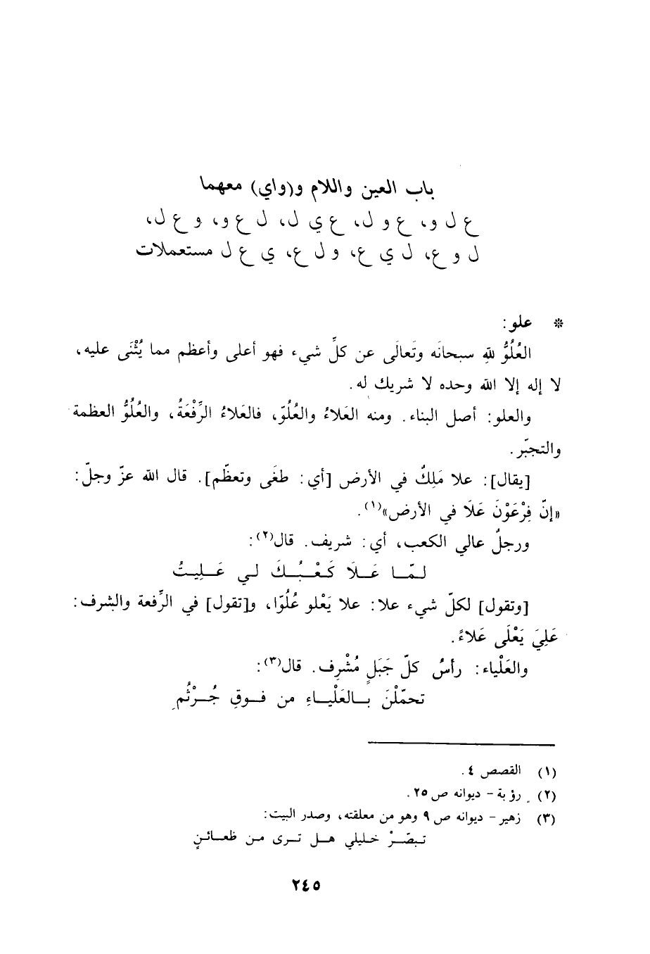 علو: العُلُوٌّ للهِ سبحانَه وتَعَالَى عن كلِّ شيء فهو أعلى وأعظم مما يُثْنَى عليه، لا إله إلا الله وحده لا شريك له. والعلو: أصل البناء. ومنه العَلاءُ والعُلُوّ، فالعَلاءُ الرِّفْعَةُ، والعُلُوُّ العظمة والتجبّر. [يقال] : علا مَلِكٌ في الأرض [أي: طغَى وتعظّم] . قال الله عزّ وجلّ: إِنَّ فِرْعَوْنَ عَلا فِي الْأَرْضِ «1» . ورجلٌ عالي الكعب، أي: شريف. قال «2» :