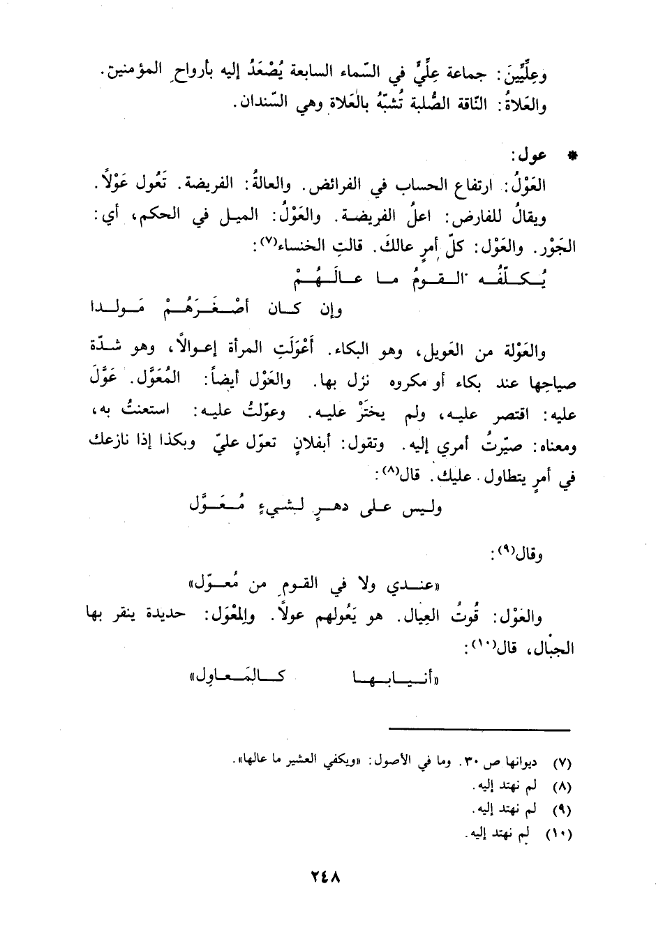 عول: العَوْلُ: ارتفاع الحساب في الفرائض. والعالةُ: الفريضة. تَعُول عَوْلاً. ويقالُ للفارض: اعلُ الفريضة. والعَوْلُ: الميل في الحكم، أي: الجَوْر. والعَوْل: كلّ أمرٍ عالكَ. قالت الخنساء «7» :