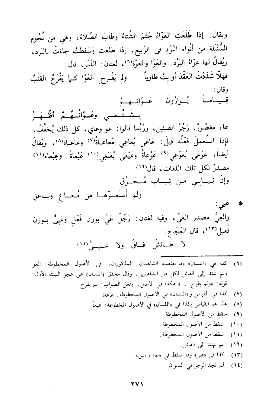 وعَاعاةً «8» ، ويُقالُ أيضاً، عَوْعَى يُعَوْعِي «9» عَوْعَاةً وعَيْعَى يُعَيْعِي «10» عَيْعاة وعِيعاء «11» مصدرٌ لكلّ تلك اللغات، قال «12» :