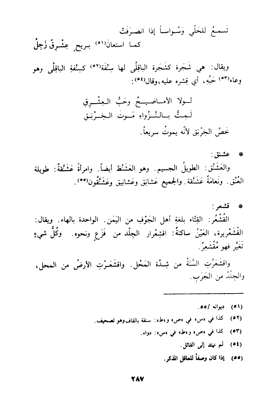 قشعر: القُشْعُر: القِثّاء بلغةِ أهل الجَوْفِ من اليَمَن. الواحدة بالهاء. ويقال: القُشَعْريرة، العَيْنُ ساكنةٌ: اقشِعْرار الجِلْد من فَزَعٍ ونحوه. وكُلُّ شيءٍ تَغَيَّر فهو مُقْشَعِرٌ. واقشَعَرَّتِ السَّنَةُ من شِدَّة المَحْل. واقشَعَرَّتِ الأرضُ من المحل، والجِلْدُ من الجَرَبِ.