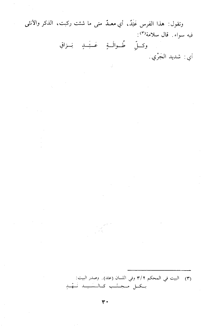 وتقول: هذا الفرس عَتِدٌ، أي معدّ متى ما شئت ركبت، الذكر والأنثى فيه سواء. قال سلامة «3» :