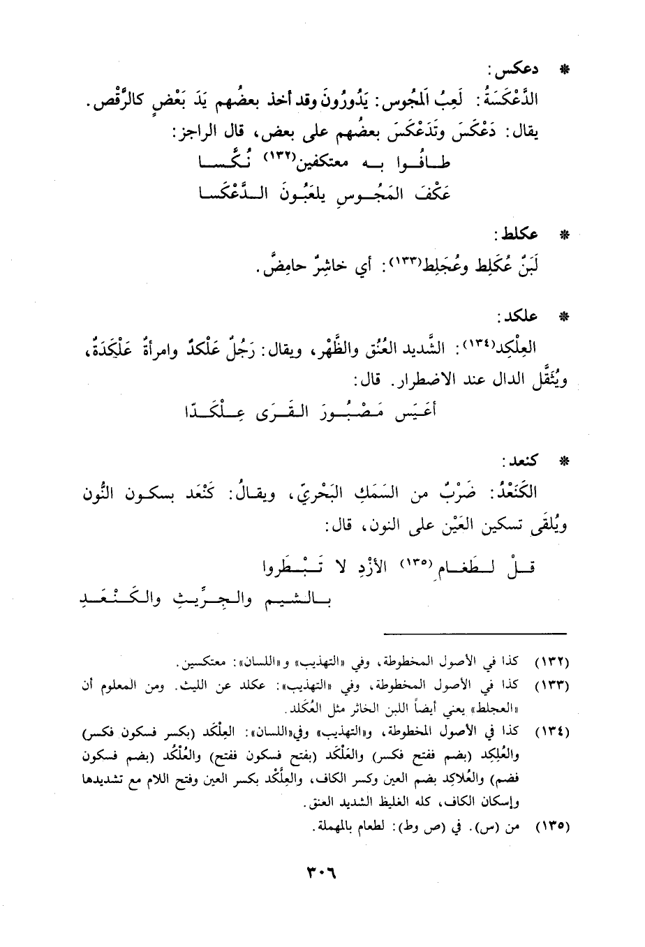 (134) كذا في الأصول المخطوطة، والتهذيب وفي اللسان: العلكد (بكسر فسكون فكسر) والعلكد (بضم ففتح فكسر) والعلكد (بفتح فسكون ففتح) والعلكد (بضم فسكون فضم) والعلاكد بضم العين وكسر الكاف، والعلكد بكسر العين وفتح اللام مع تشديدها وإسكان الكاف، كله الغليظ الشديد العنق.