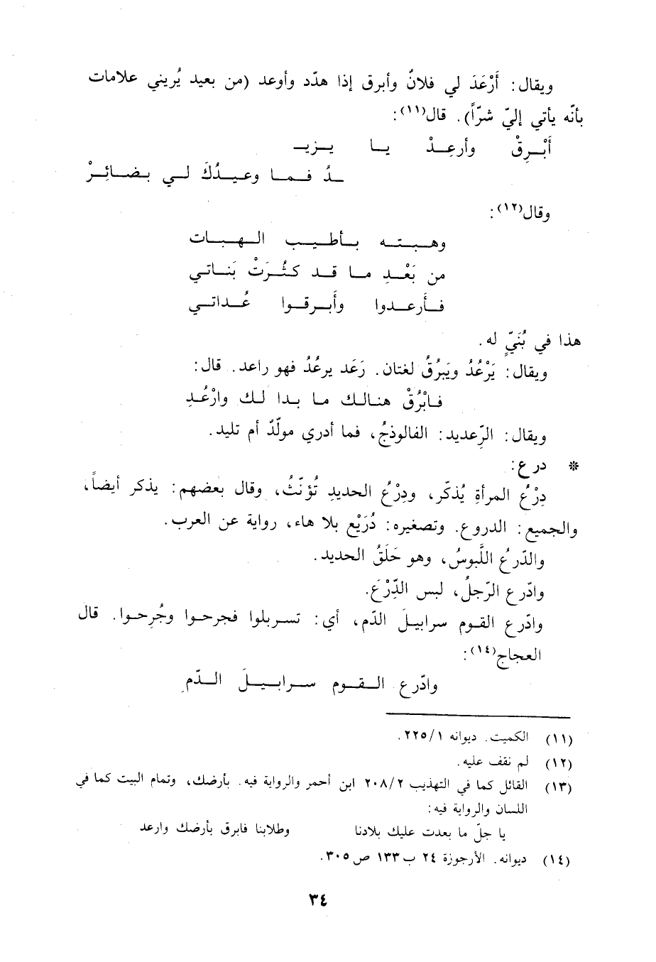 ويقال: أَرْعَدَ لي فلانٌ وأبرق إذا هدّد وأوعد (من بعيد يُريني علامات بأنّه يأتي إلي شرّاً) . قال «11» :