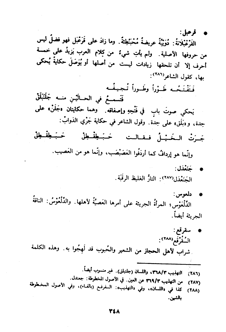 قرعبل: القَرْعْبْلانةُ: دُوَيْبَّةٌ عريضةٌ مُحْبَنْطِئةٌ. وما زادَ على قَرَعْبَل فهو فضلٌ ليس من حروفها الأصلية. ولم يأتِ شيءٌ من كلام العرب يَزيدُ على خمسة أحرف إلا أن تلحقها زيادات ليست من أصلها أو يُوَصَلَ حكايةً يُحكى بها، كقول الشاعر «286» :
