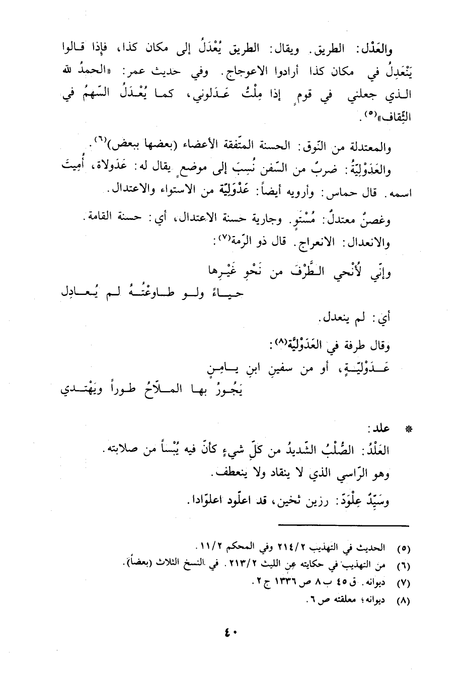 والمعتدلة من النّوق: الحسنة المتّفقة الأعضاء (بعضها ببعض) «6» . والعَدَوْلِيّةُ: ضربٌ من السّفن نُسِبَ إلى موضعٍ يقال له: عَدَولاة، أُمِيتَ اسمه. قال حماس: وأرويه أيضاً: عَدْوَلِيّة من الاستواء والإعتدال. وغصنٌ معتدل: مستو. وو جارية حسنة الاعتدال، أي: حسنة القامة. والانعدال: الانعراج. قال ذو الرّمة «7» :