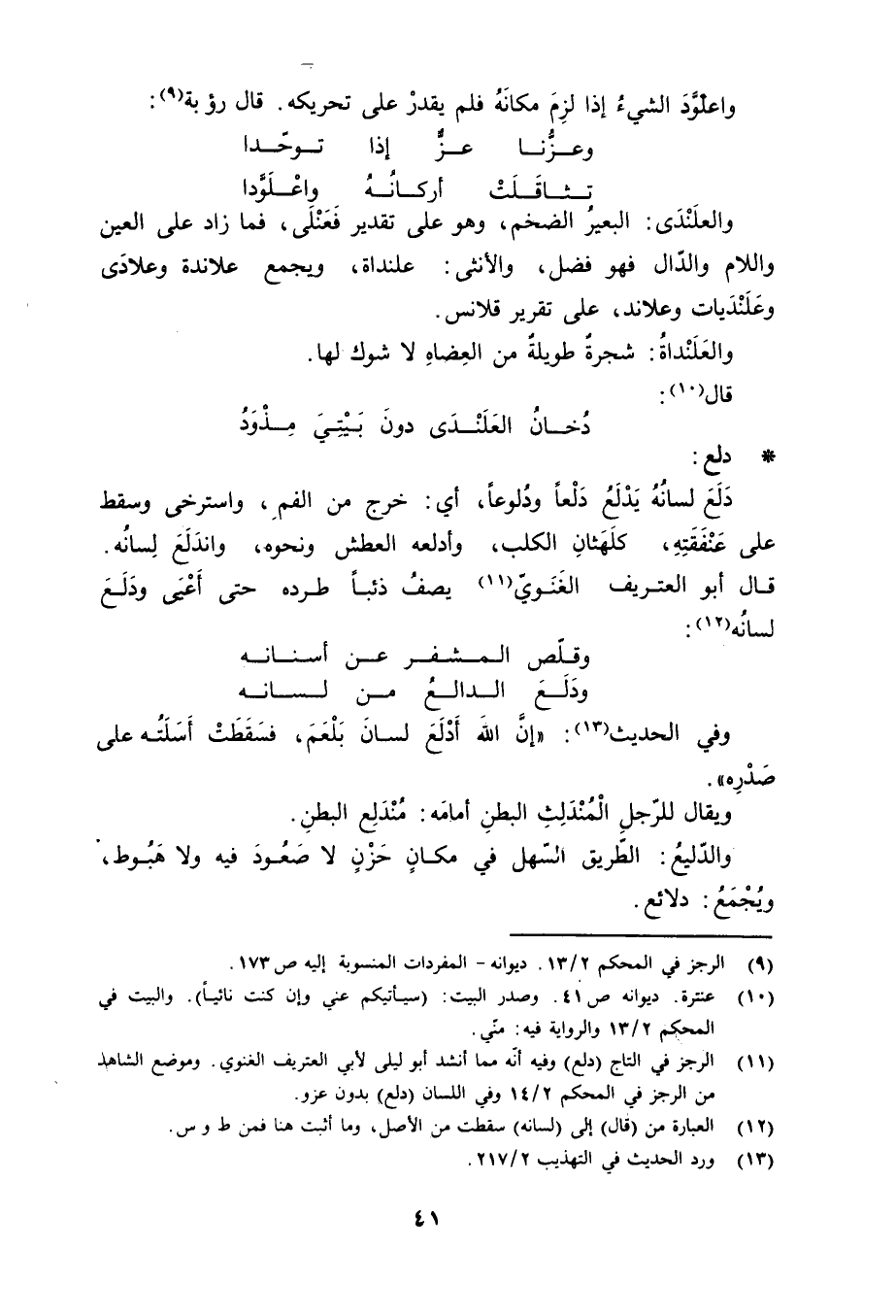 (11) الرجز في التاج (دلع) وفيه أنه مما أنشد (أبو ليلى) لأبي العتريف الغنوي. وموضع الشاهد من الرجز في المحكم 2/ 14 وفي اللسان (دلع) بدون عزو.