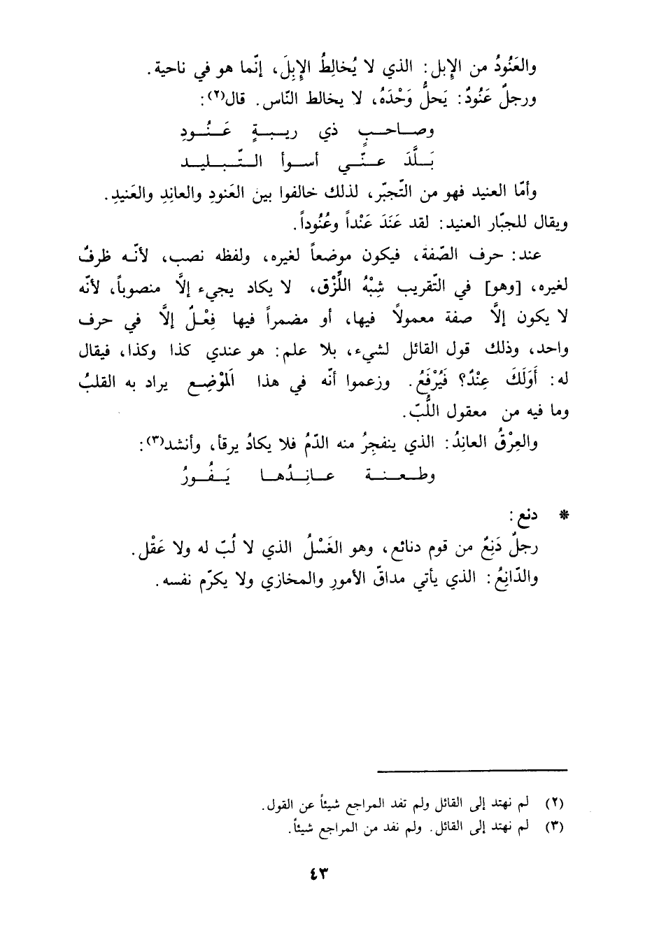 وأمّا العنيد فهو من التّجبّر، لذلك خالفوا بين العَنودِ والعانِدِ والعَنيدِ. ويقال للجبّار العنيد: لقد عَنَدَ عَنْداً وعُنُوداً. عند: حرف الصفة، فيكون موضعاً لغيره، ولفظه نصب، لأنّه ظرفٌ لغيره، [وهو] في التّقريب شِبْهُ اللِّزْق، لا يكاد يجيء إلا منصوباً، لأنّه لا يكون إلا صفة معمولاً فيها، أو مضمراً فيها فِعْلٌ إلا في حرف واحد، وذلك قول القائل لشيء، بلا علم: هو عندي كذا وكذا، فيقال له: أَوَلَكَ عِنْدٌ؟ فَيُرْفَعُ. وزعموا أنّه في هذا الموضِع يراد به القلبُ وما فيه من معقول اللُّبّ. والعرق العانِدُ: الذي ينفجِرُ منه الدّمُ فلا يكادُ يرقأ، وأنشد «3» :