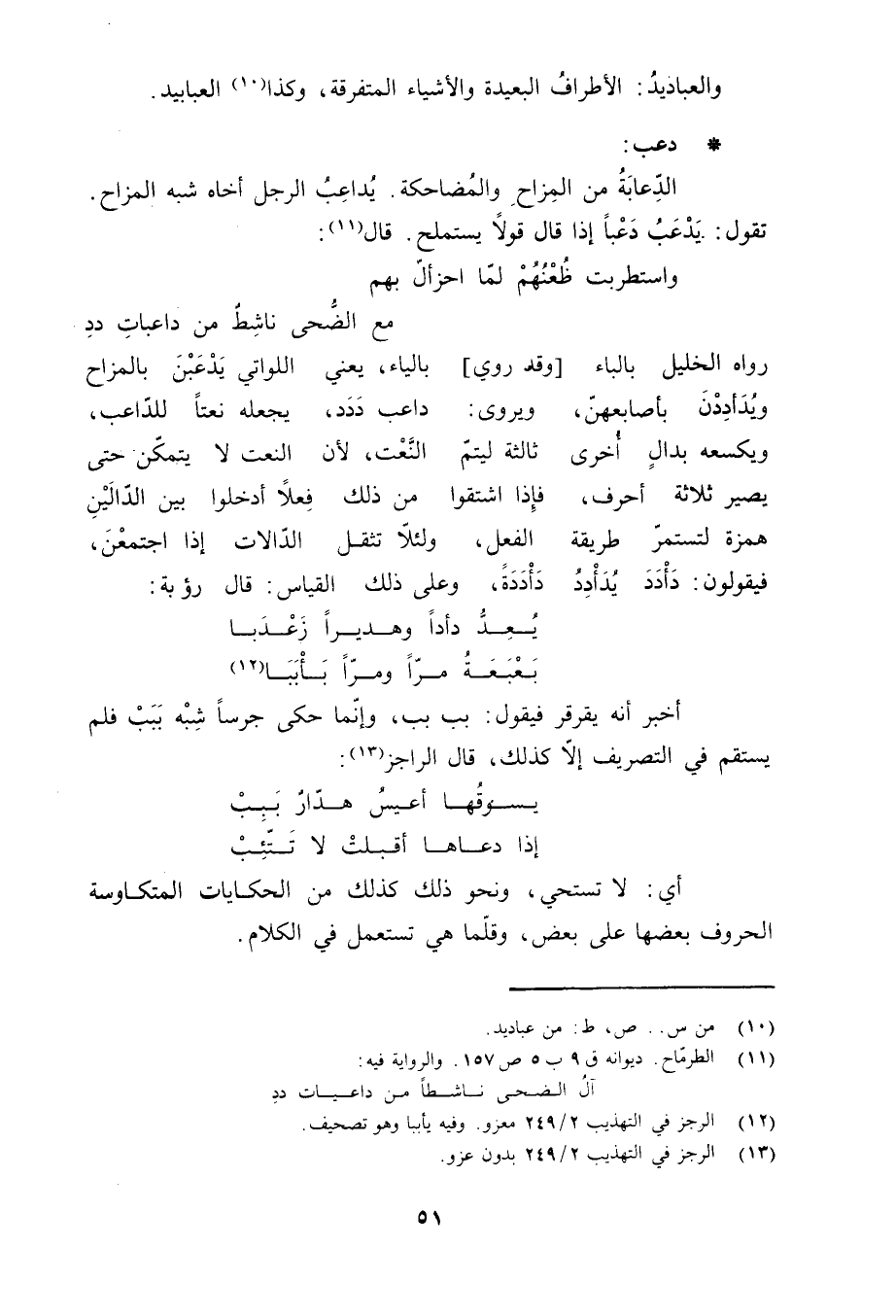رواه الخليل بالباء [وقد روي] بالياء، يعني اللواتي يَدْعَبْنَ بالمزاح ويُدَأدِدْنَ بأصابعهنّ، ويروى: داعب دَدَد، يجعله نعتا للداعب، ويكسعه بدالٍ أُخرى ثالثة ليتمّ النَّعْت، لأن النعت لا يتمكّن حتى يصير ثلاثة أحرف، فإذا اشتقوا من ذلك فِعلاً أدخلوا بين الدّالَيْنِ همزة لتستمرّ طريقة الفعل، ولئلاّ تثقل الدّالات إذا اجتمعْنَ، فيقولون: دَأْدَدَ يُدَأْدِدُ دَأْدَدَةً، وعلى ذلك القياس: قال رؤبة: