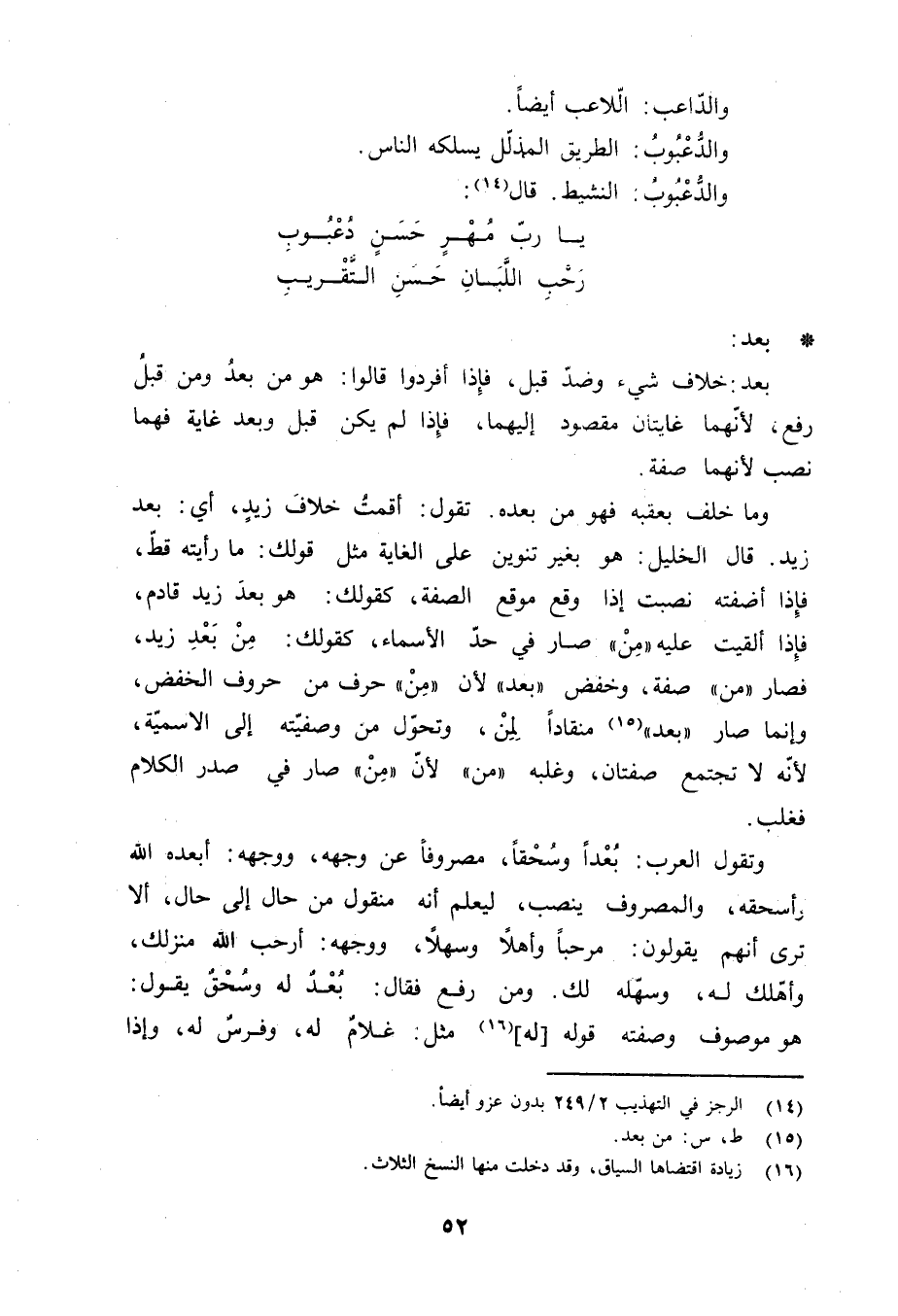 بعد: بعد: خلاف شيء وضدّ قبل، فإذا أفردوا قالوا: هو من بعدُ ومن قبلُ رفع، لأنّهما غايتان مقصود إليهما، فإذا لم يكن قبل وبعد غاية فهما نصب لأنهما صفة. وما خلف بعقبه فهو من بعده. تقول: أقمتُ خلافَ زيدٍ، أي: بعد زيد. قال الخليل: هو بغير تنوين على الغاية مثل قولك: ما رأيته قطّ، فإذا أضفته نصبت إذا وقع موقع الصفة، كقولك: هو بعدَ زيد قادم، فإذا ألقيت عليه من صار في حدّ الأسماء، كقولك: مِنْ بَعْدِ زيد، فصار من صفة، وخفض بعد لأن مِنْ حرف من حروف الخفض، وإنما صار بعد «15» منقاداً لِمِنْ، وتحوّل من وصفيته إلى الاسمية، لأنه لا تجتمع صفتان، وغلبه من لأن من صار في صدر الكلام فغلب. وتقول العرب: بُعْداً وسُحْقاً، مصروفاً عن وجهه، ووجهه: أبعده الله وأسحقه، والمصروف ينصب، ليعلم أنه منقول من حال إلى حال، ألا ترى أنهم يقولون: مرحباً وأهلاً وسهلاً، ووجهه: أرحب الله منزلك، وأهّلك له، وسهّله لك. ومن رفع فقال: بُعْدٌ له وسُحْقٌ يقول: هو موصوف وصفته قوله [له] «16» مثل: غلامٌ له، وفرسٌ له، وإذا