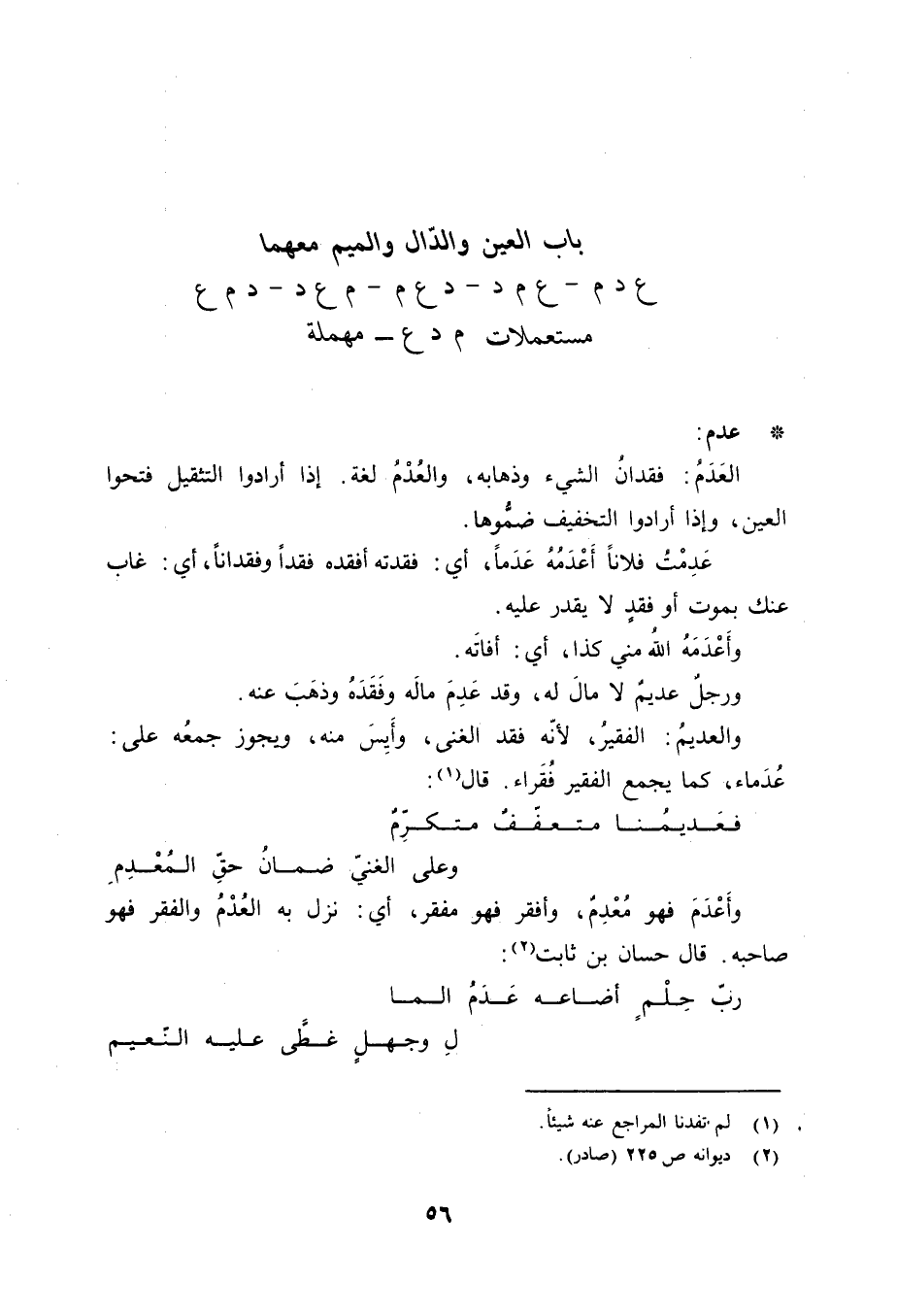 عدم: العَدَمُ: فقدانُ الشيء وذهابه، والعُدْمُ لغة. إذا أرادوا التثقيل فتحوا العين، وإذا أرادوا التخفيف ضمُّوها. عَدِمْتُ فلاناً أَعْدَمُهُ عَدَماً، أي: فقدته أفقده فقداً وفقداناً، أي: غاب عنك بموت أو فقدٍ لا يقدر عليه. وأَعْدَمَهُ الله مني كذا، أي: أفاتَه. ورجلٌ عديمٌ لا مالَ له، وقد عَدِمَ مالَه وفَقَدَهُ وذهَبَ عنه. والعديمُ: الفقيرُ، لأنّه فقد الغنى، وأَيِسَ منه، ويجوز جمعُه على: عُدَماء، كما يجمع الفقير فُقَراء. قال «1» :