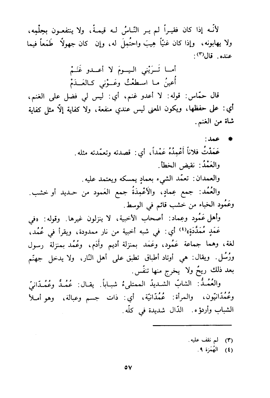 «4» أي: في شبه أخبية من نار ممدودة، ويقرأ في عُمُد، لغة، وهما جماعة عَمُود، وعَمَد بمنزلة أديم وأَدَم، وعُمُد بمنزلة رسول ورُسُل. ويقال: هي أوتاد أطباق تطبق على أهل النّار، ولا يدخل جهنّم بعد ذلك ريحٌ ولا يخرج منها تنفّس. والعُمُدُّ: الشابّ الشديدُ الممتلىءُ شباباً. يقال: عُمُدٌّ وعُمُدّانيّ وعُمُدّانيّون، والمرأة: عُمُدّانيّة، أي: ذات جسم وعبالة، وهو أملأ الشباب وأردؤه. الدّال شديدة في كله.
