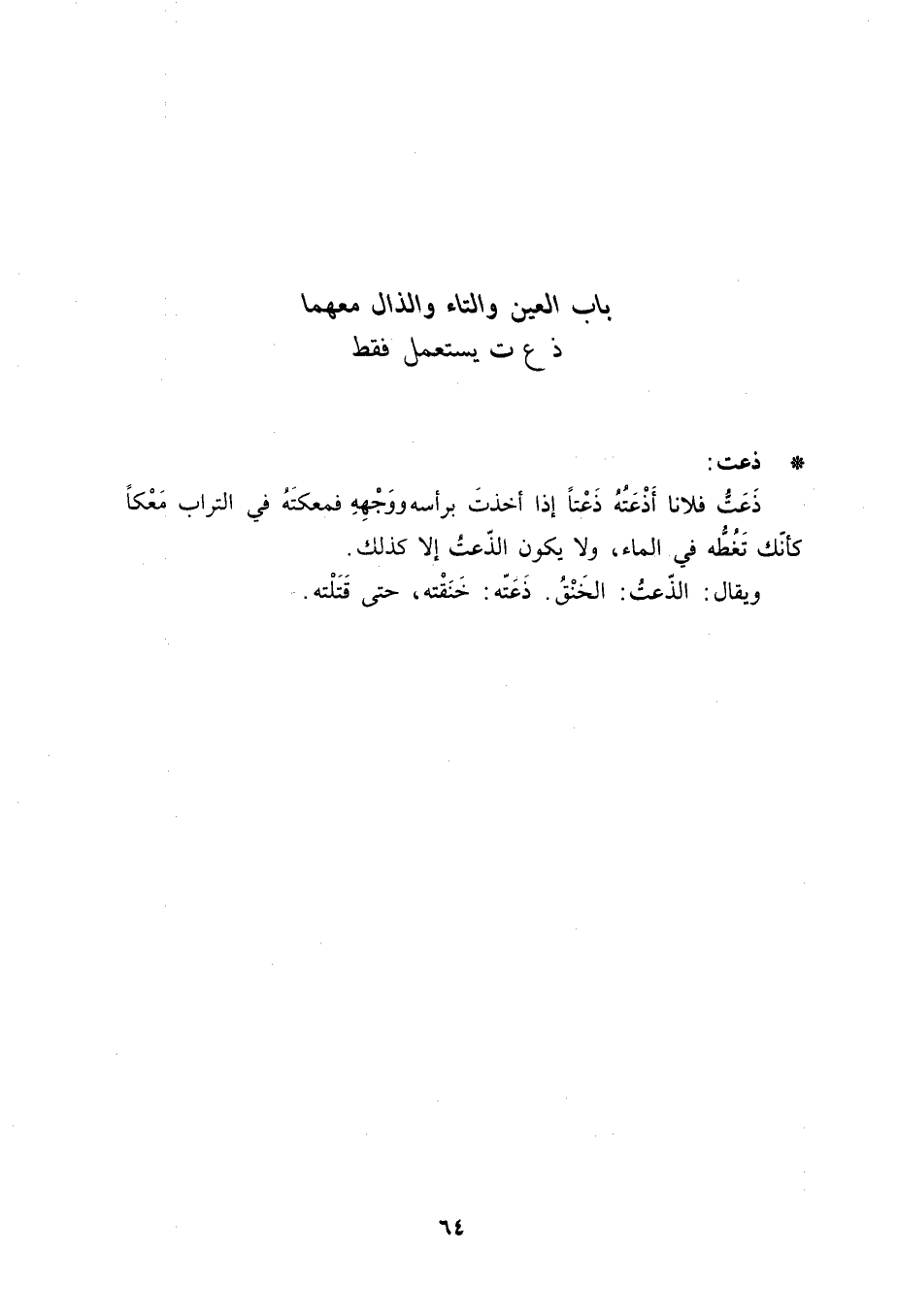 ذعت: ذَعَتُّ فلاناً أَذْعَتُهُ ذَعْتاً إذا أخذتَ برأسه ووَجْهِهِ فمعكتَهُ في التراب مَعْكاً كأنّك تَغُطُّه في الماء، ولا يكون الذّعتُ إلا كذلك. ويقال: الذّعتُ: الخَنْقُ. ذَعَتّه: خَنَقْته، حتى قَتَلْته.
