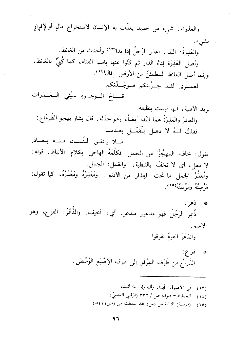 والعذراء: شيء من حديد يعذّب به الإنسان لاستخراج مالٍ أو لإقرارِ بشيء. والعَذِرةُ: البَدَا، أعذر الرّجلُ إذا بدا «13» وأحدث من الغائط. وأصل العَذِرَةُ فِناءُ الدار ثم كنّوا عنها باسم الفِناء، كما كُنِّيَ بالغائط، وإنّما أصل الغائط المطمئنّ من الأرض. قال «14» :